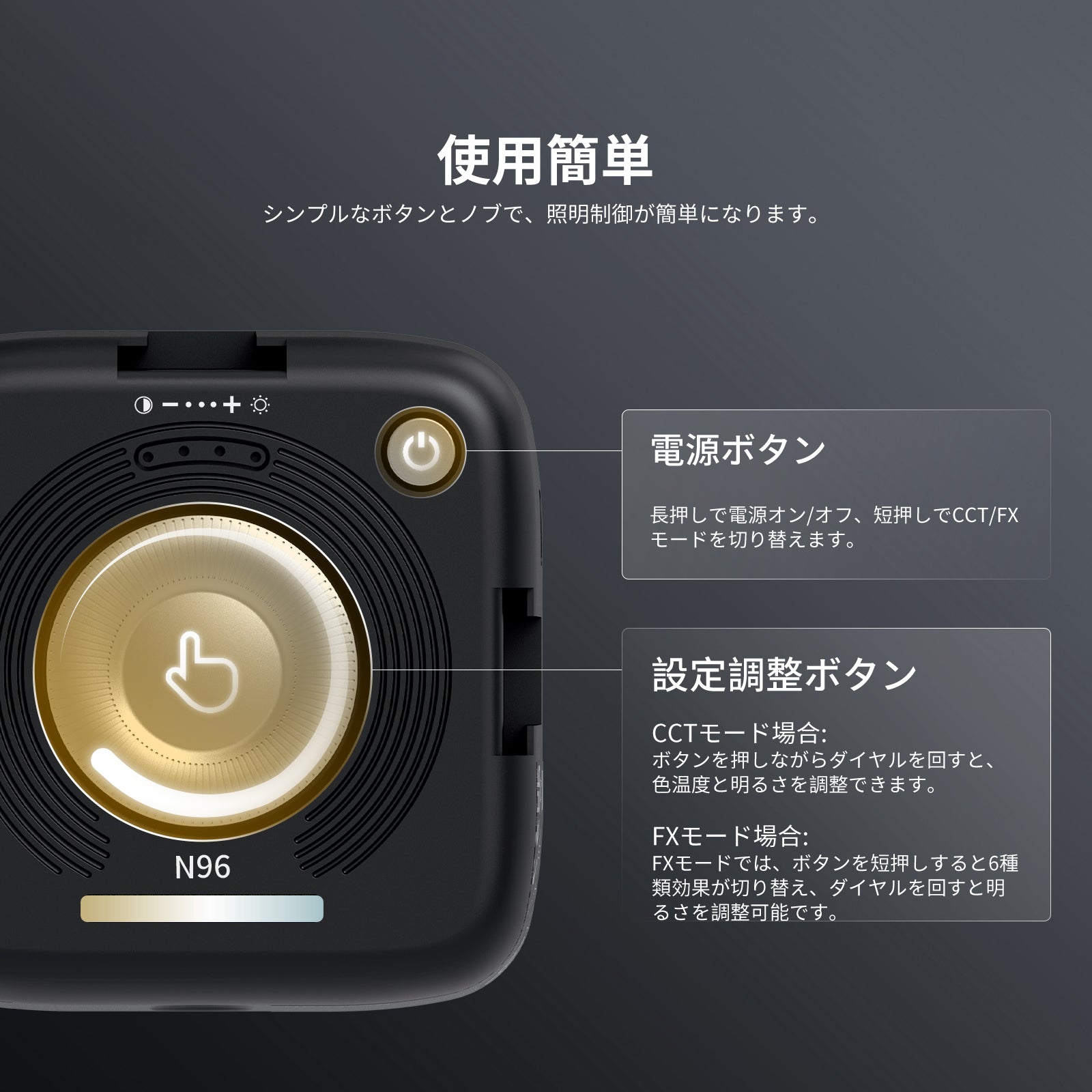 - 【コンパクト&ポータブル】N96は、ポケットサイズのミニLEDパネルライトです。サイズは76x76x35mm、ディフューザー込みでわずか108gです。ノートパソコンにクランプで固定したり、マグネットで取り付けてキーライトや補助照明として美しい瞬間を捉えます。シンプルなボタンとノブで照明操作を効率化になり、ソーシャルメディアコンテンツクリエイター、化粧師、ライブストリーマー、インフルエンサーにとって必要な機材であり、自撮りライトとしても活躍します。