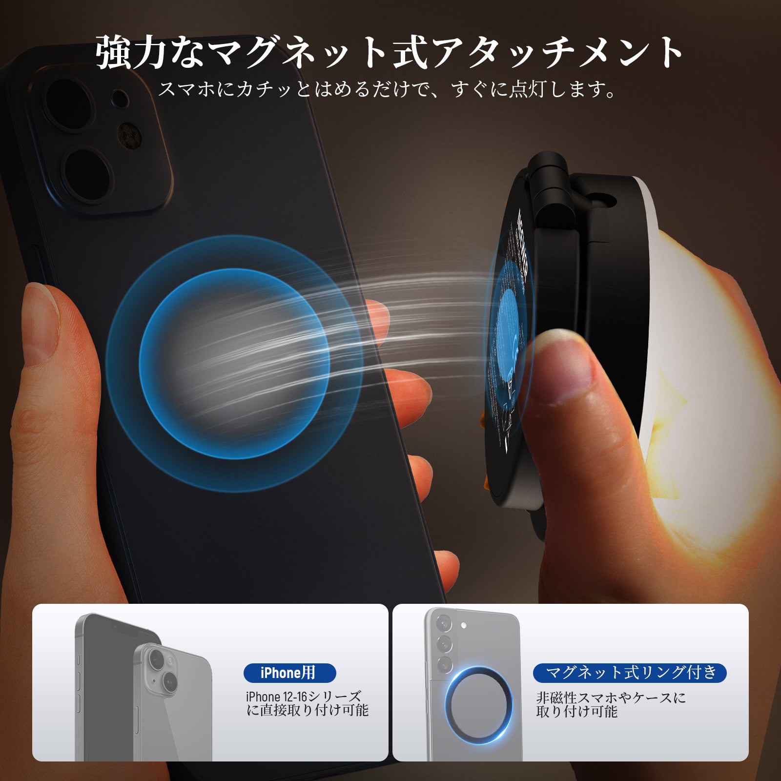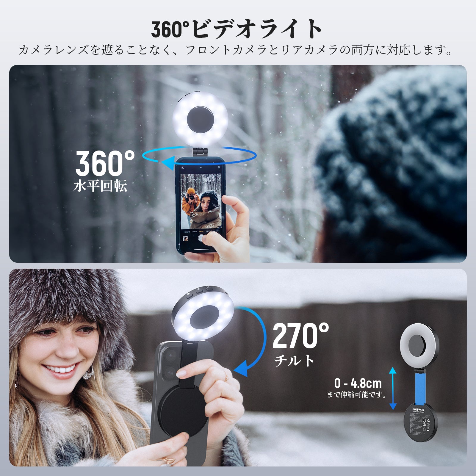 - 【360°回転&マグネットリング付き】NL40R スマホ用リングライトは、MagSafe対応のiPhone 16 Pro Max/Plus、15/14/13/12 、iPad Proに直接磁着可能です。また、他の磁気吸着デバイスにも対応しています。非対応デバイスには、付属の粘着式マグネットシートまたは取り付けクリップをご利用いただけます。これにより、俯瞰撮影や、卓上ノートパソコンへの取り付けも可能。Galaxy S25 S24 S23 Ultraなどと互換性があります。水平360°回転、垂直270°チルトに回転可能で、メイン/セルフィーカメラどちらにも補助照明として活用いただけます。