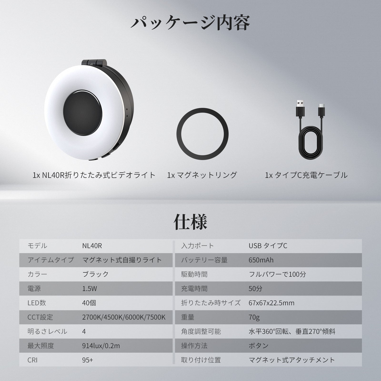 - 【コンパクト&小型軽量】NL40R LED自撮りライトは、折りたたみ時わずか67x67x22.5mm、重量は約70gと超コンパクト。ポケットに楽々収まり、外出先での撮影に最適なアクセサリーです。40個の高品質の暖色系と寒色系のLEDを搭載、914lux (0.2m)の照度と95+ CRIの高演色性を実現。スマホでの自撮り、写真撮影やビデオコールに最適で、肌を明るく見せ、顔のくすみを軽減し、カメラ映りを美しくします。