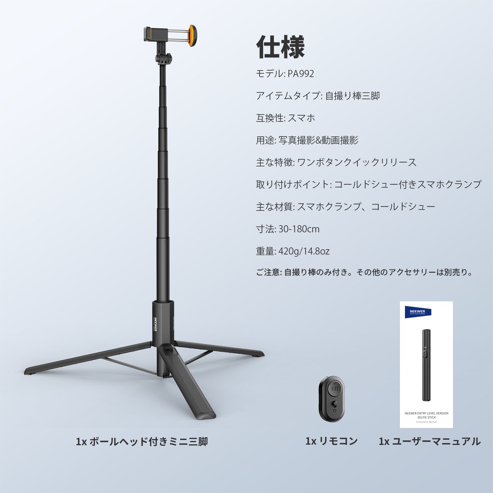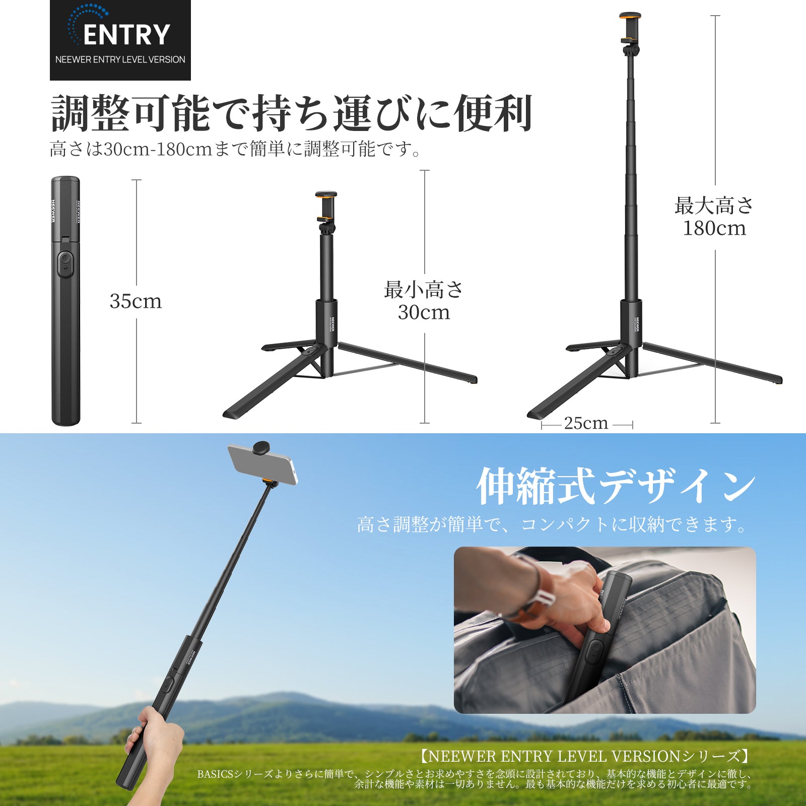 - 【NEEWER ENTRY LEVEL VERSIONシリーズ】BASICSシリーズよりさらに簡単で、シンプルさとお求めやすさを念頭に設計されており、基本的な機能とデザインに徹し、余計な機能や素材は一切ありません。最も基本的な機能だけを求める初心者に最適です。 PA988は、ポータブルな自撮り棒と安定したスマホ用三脚を一体化させ、様々な撮影シーンに対応します。重さはわずか350g、折りたたみ時の全長は34cm、持ち運びや収納に便利です。
