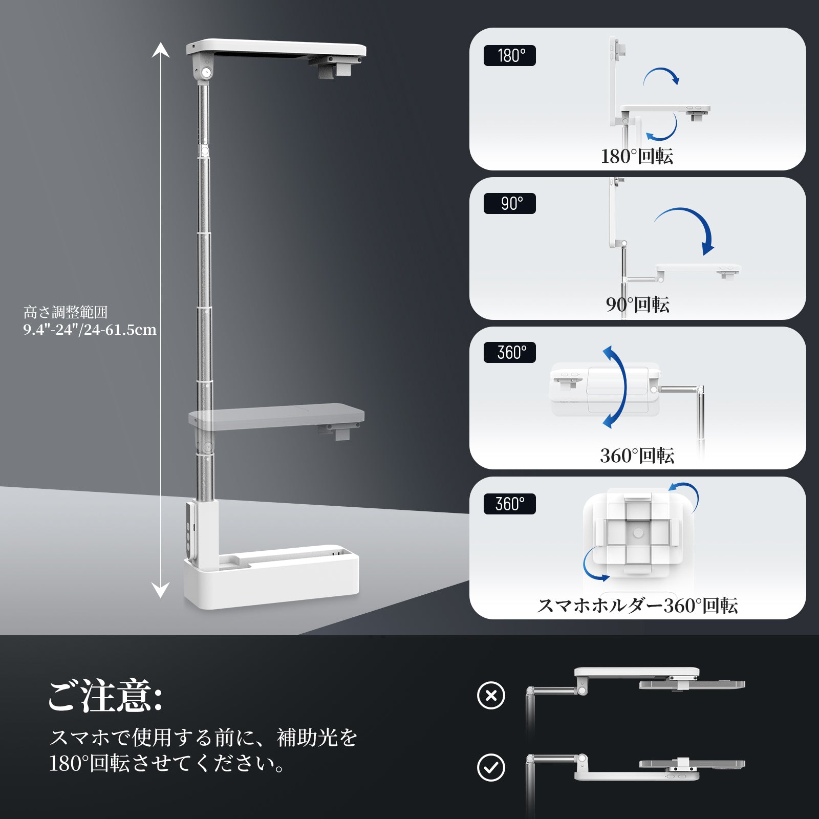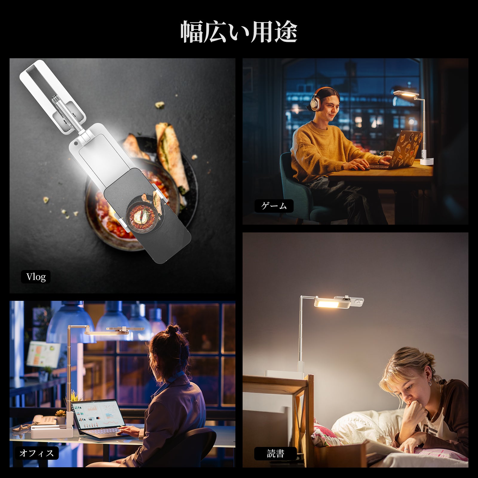 【柔軟な角度調整】ライトヘッドは360°回転、180°傾斜、ライトパネルは180°反転、上部の伸縮部分は90°折りたたみ可能です。頭上、上方、縦向き、横向きなど、どんな撮影でも、スマホホルダー付き多機能自撮りスタンドに対応します。ソーシャルメディアコンテンツの作成だけでなく、メイクアップアーティストのストリーミング、ノートパソコン/コンピューターモニターのウェブカメラを使った卓上ビデオ会議、ズームコール、ビデオ会議、ポッドキャストのビデオ撮影、バーチャル会議などにも、柔らかな照明を提供します。