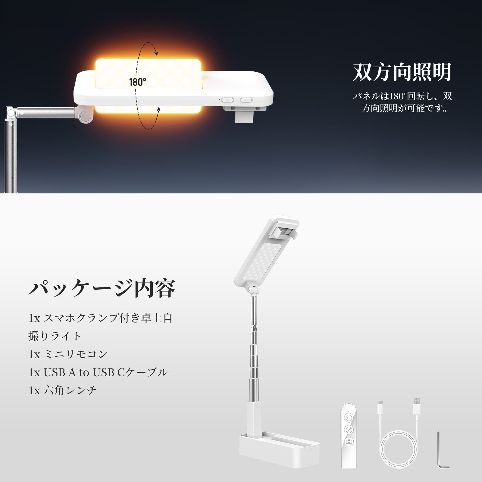 - 【スマホ撮影に最適】回転式スマホクリップホルダーは、コンパチブル iPhone 11 Pro Max、Androidなど。ポータブルな俯瞰スマホマウントスタンドはLEDライトを付いており、コンテンツクリエイター、ストリーマー、インフルエンサーにとって、TikTok/YouTube動画撮影、写真撮影、自撮りなどに必要な照明アクセサリーとして最適です。USB C接続の2in1リモコンで、カラーモード、明るさ、スマホカメラのシャッターボタンを操作できます。リモコンは5V 1A入力のみに対応しており、PD急速充電には対応していません。