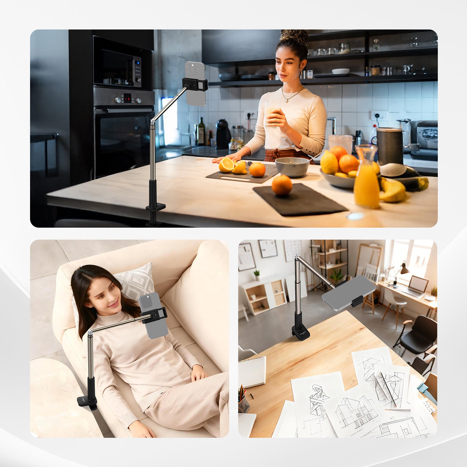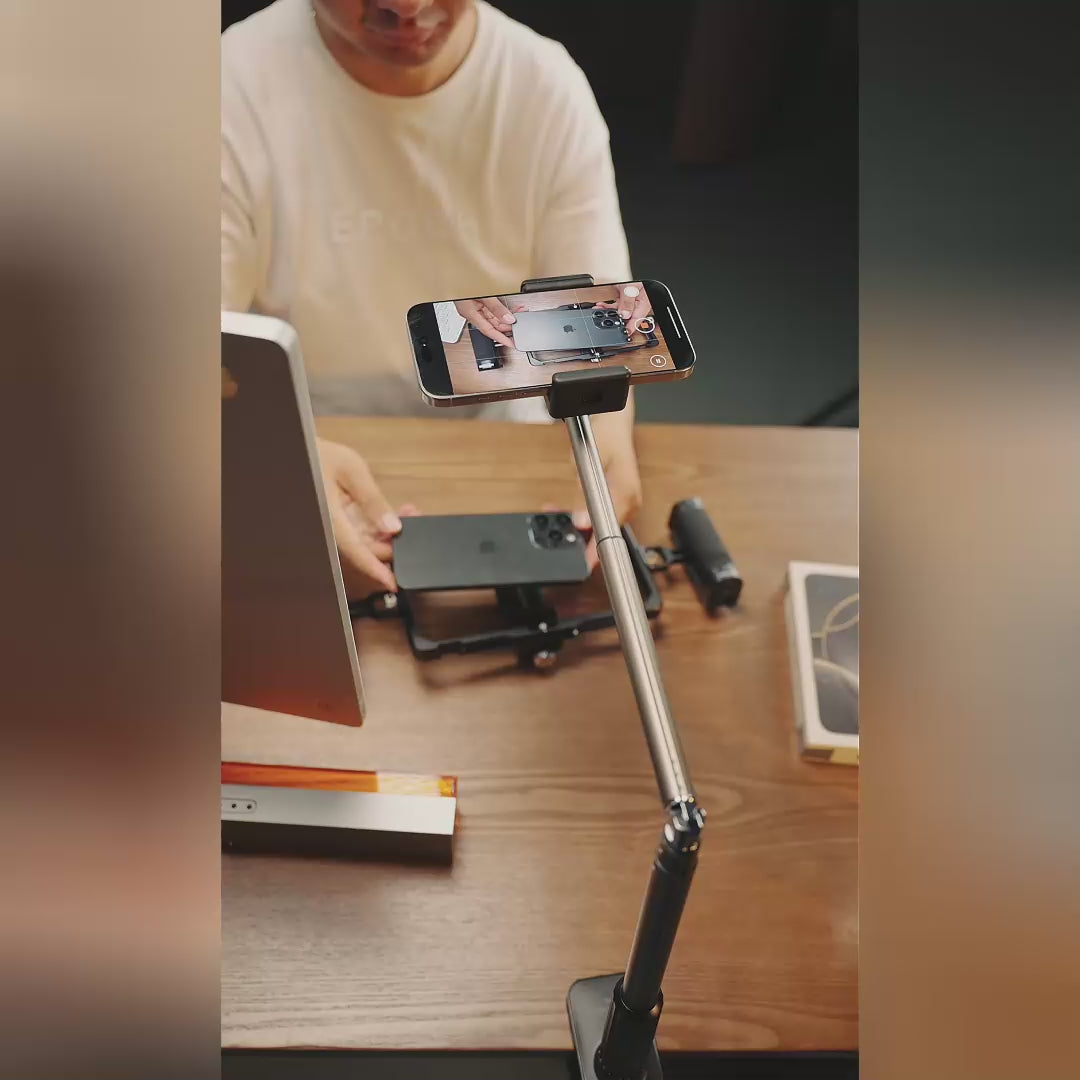 - 【卓上スマホスタンド】オーバーヘッドスマホマウントは伸縮式関節式アームを備えており、コンテンツクリエイターにとって必要なアイテムとして、快適な視聴体験を提供し、動画視聴、生放送、ベッドサイドスタンド、ホームオフィスの卓上でのビデオコール、コンテンツ制作などに最適です。