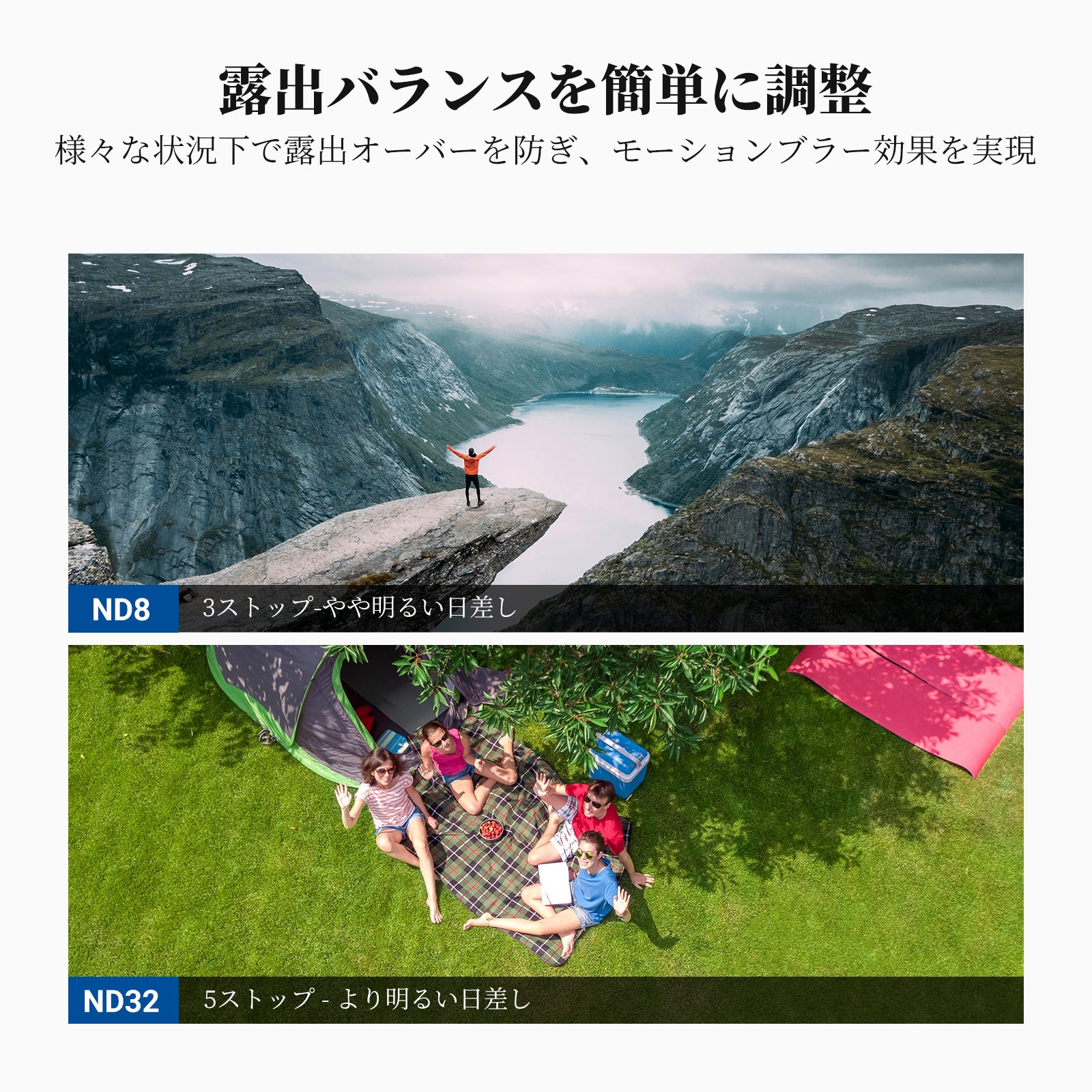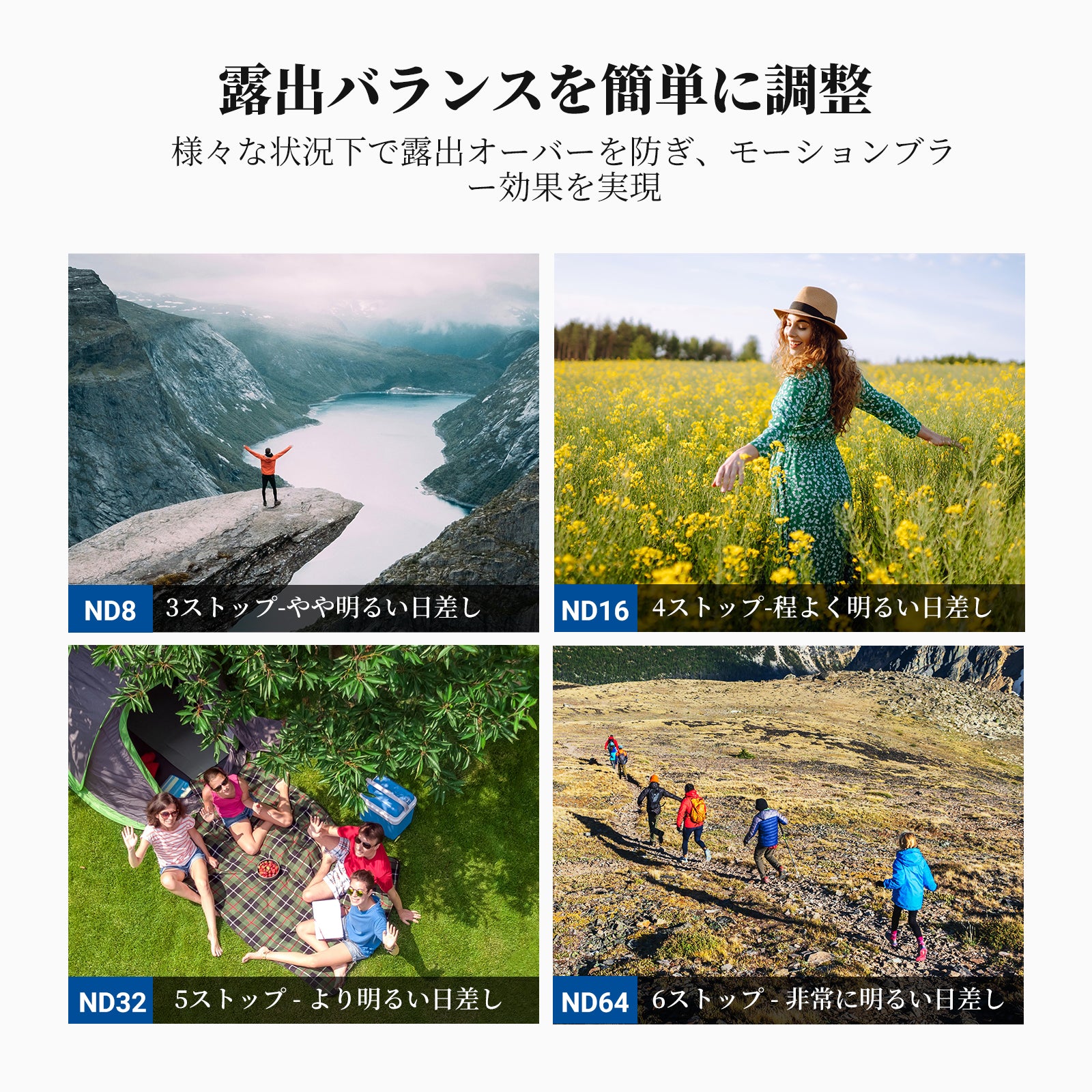 - 【露出バランスを楽に調整】4種類NDフィルター(ND 8/16/32/64)は、屋外での長時間露光撮影で、3、4、5、6ストップ減光効果を発揮します。川や滝など動きのある被写体を、表現力豊かなモーションブラーで撮影できます。