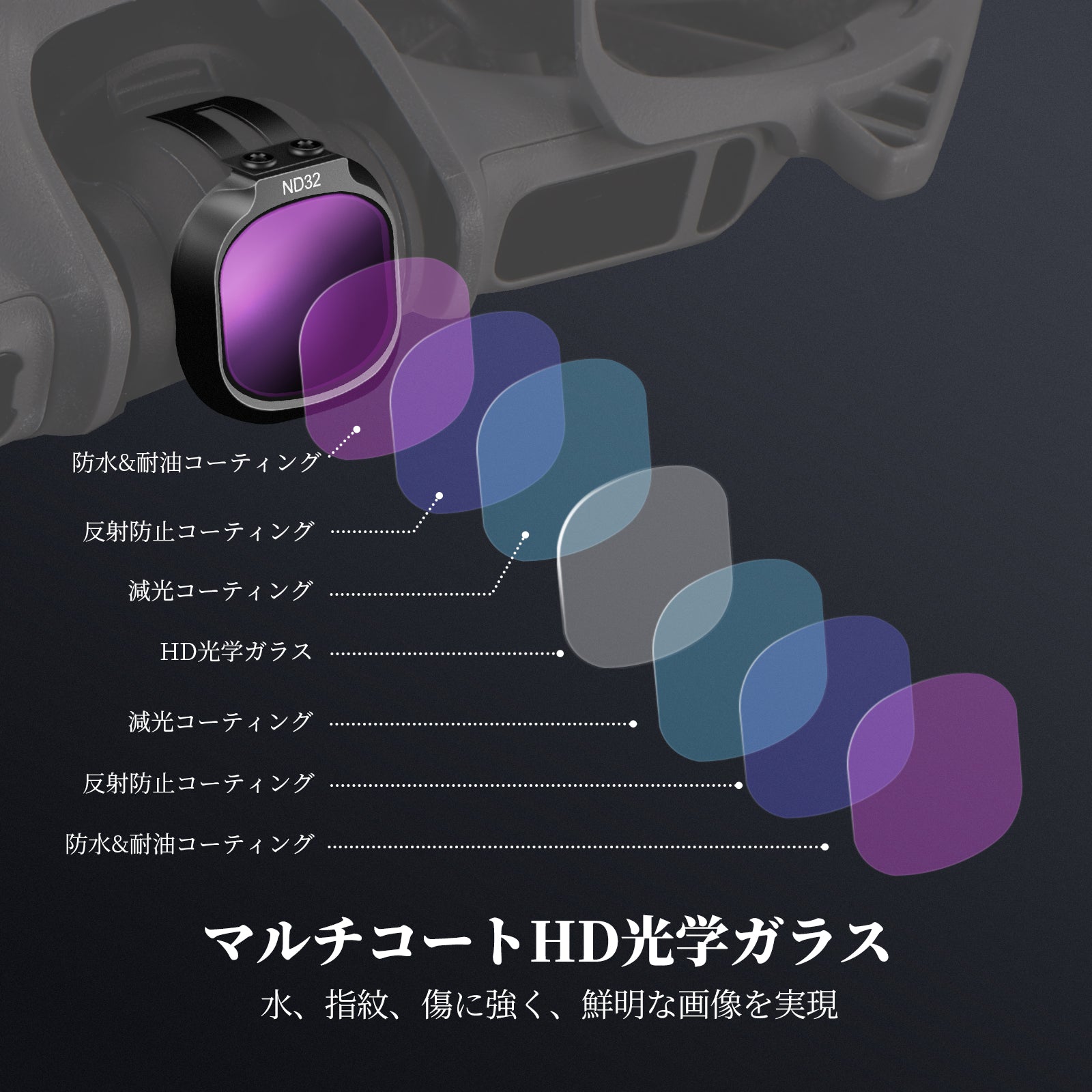 【HDガラス&スナップオン設計】マルチコートHD光学ガラスは、水、指紋、傷に強く、鮮明で自然な画像を実現します。フィルターをフックでカメラにスナップするだけで、飛行中もしっかりと固定できます。