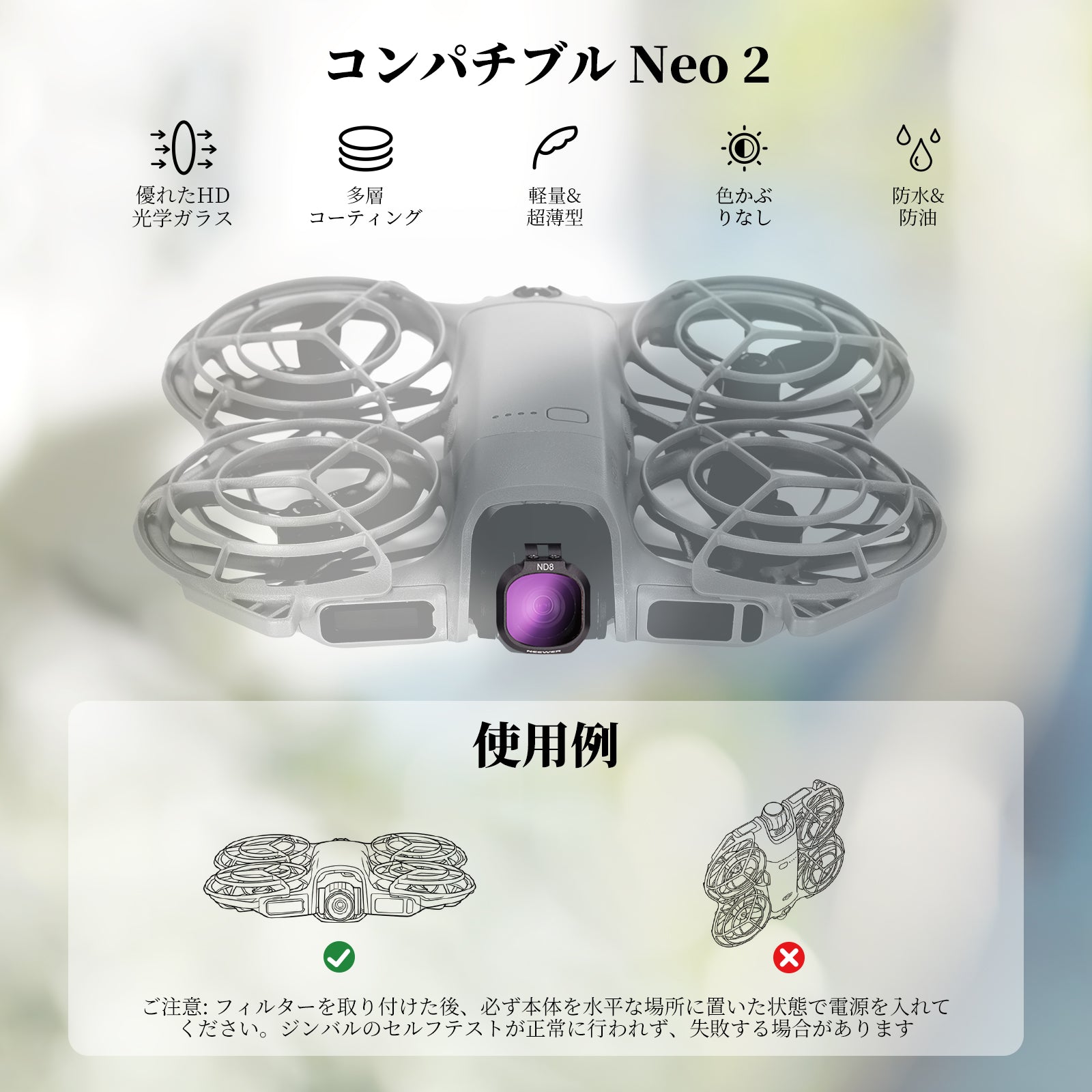 - 【NEO 2対応】フィルターアクセサリーキットは、NEO 2ドローンに対応し、UVフィルター1枚、CPL(円偏光)フィルター1枚、NDフィルター4枚が含まれています。軽量で薄型デザインで、ジンバルの正確なパフォーマンスを維持します。