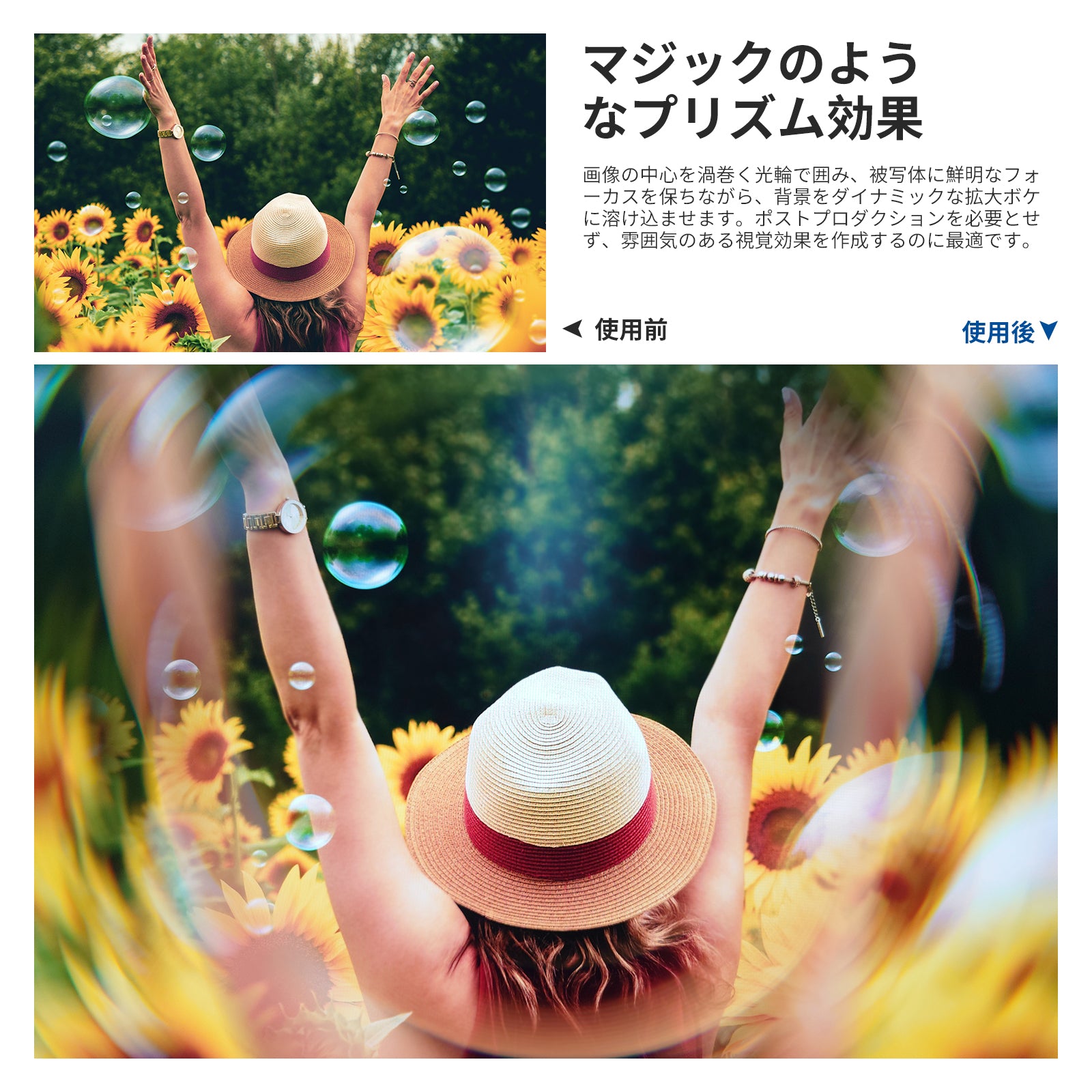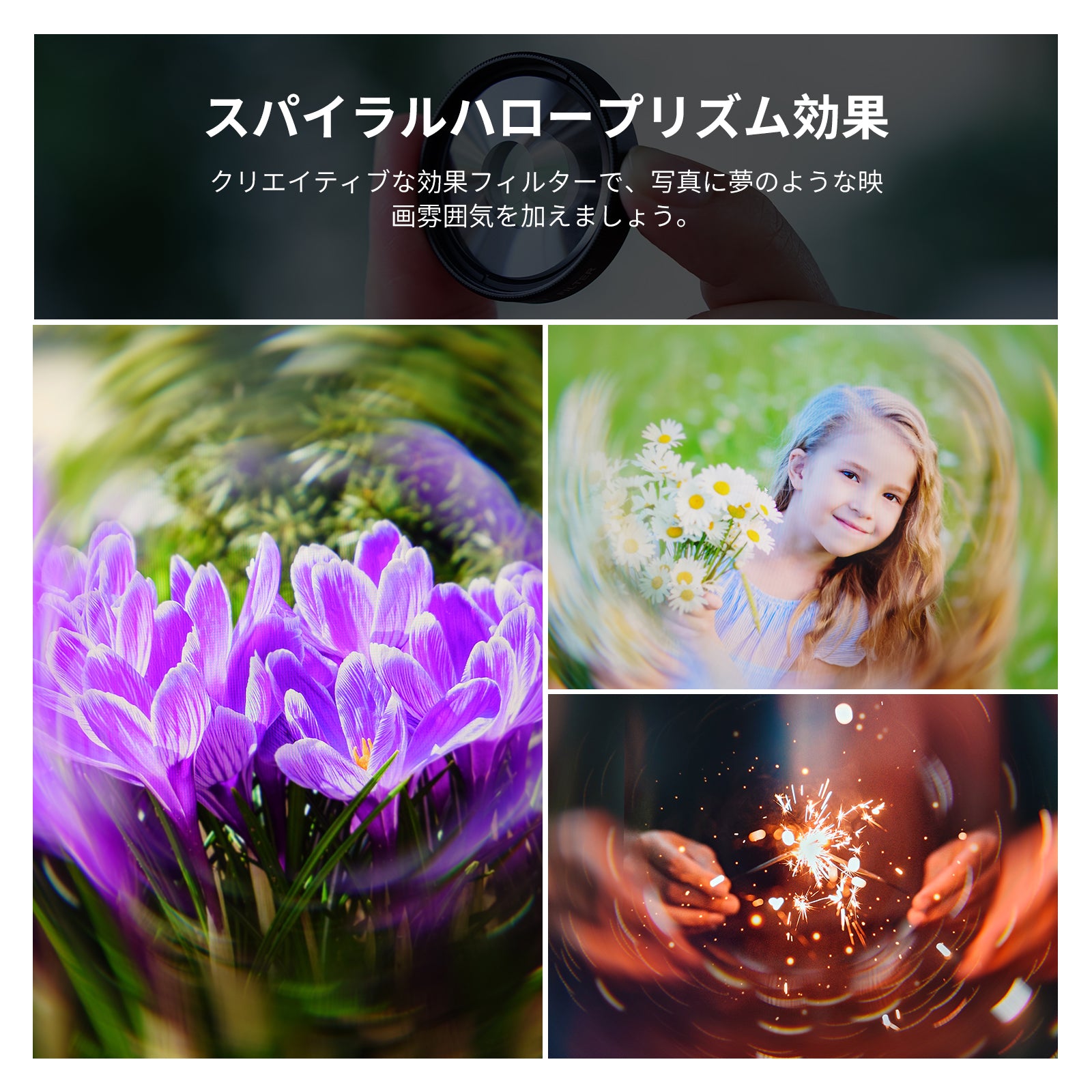 - 【スパイラルハロープリズム効果】創造な効果フィルターは、夢のような映画雰囲気を写真に加えましょう。画像の中心を渦巻くハローで囲み、被写体は鮮明にフォーカスしながら、背景はダイナミックな拡大ボケに溶け込みます。ポストプロダクションを必要とせず、雰囲気のあるビジュアルを演出できます。