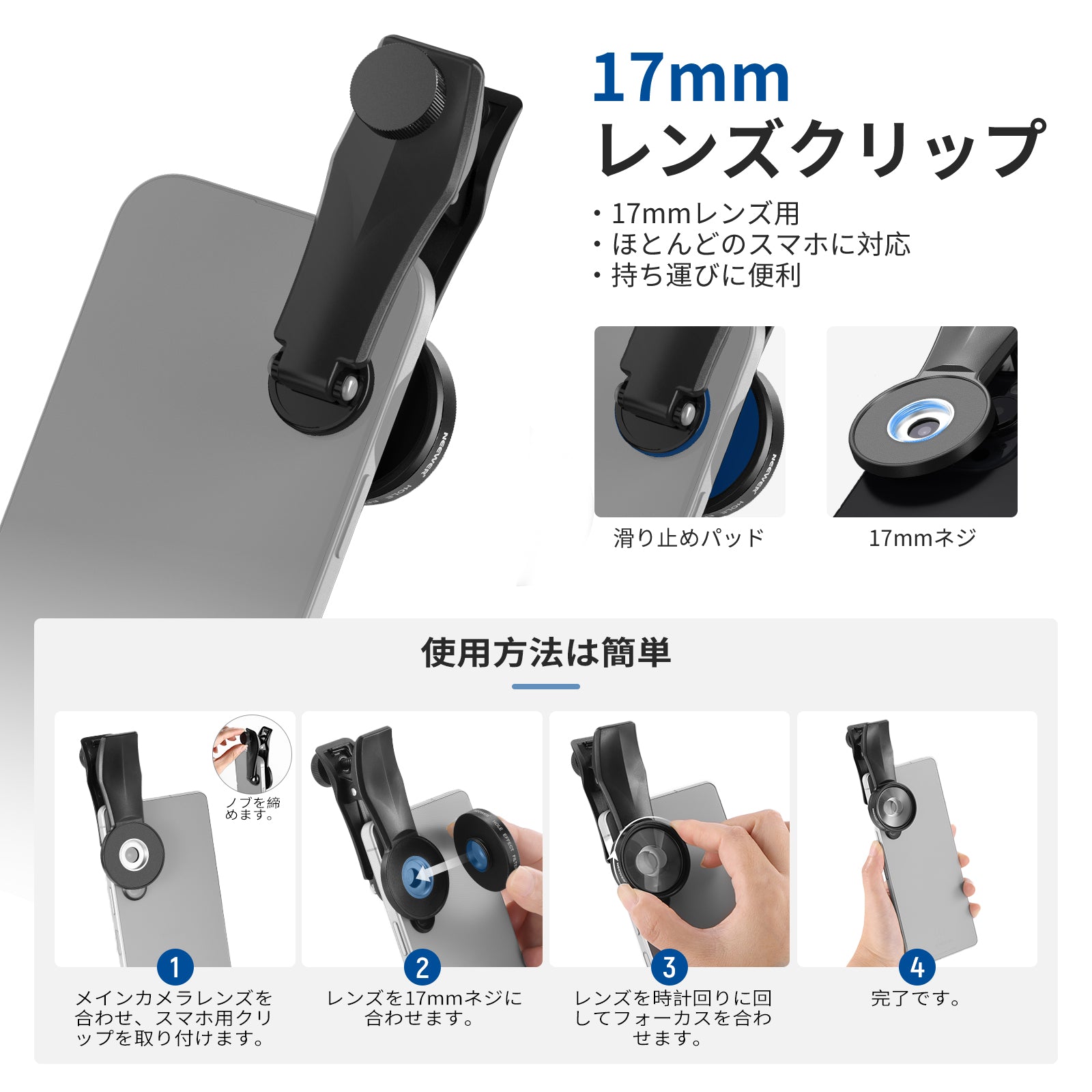 - 【17mmネジ付きスマホクリップ】付属17mmネジ付きスマホクリップを使えば、スマホホルダー、ケース、バックプレートなどにフィルターを取り付けられ、スマホのカメラで撮影した写真や動画をより鮮明に撮影できます。コンテンツクリエイターやインフルエンサーにとって、iPhone用必要な撮影アクセサリーです。