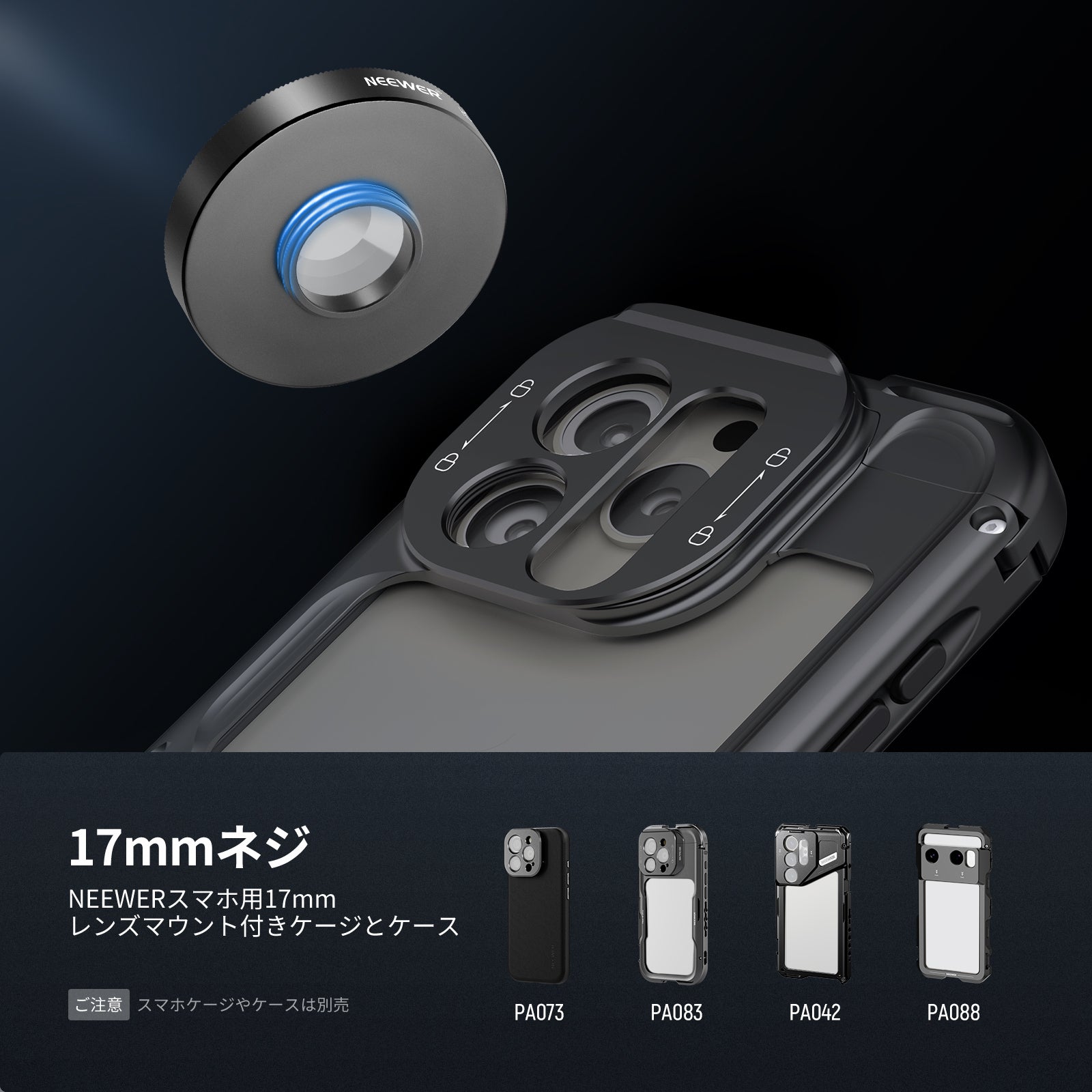 【スマホケージ/ケースとの併用】より良い結果を得るには、17mmネジ付きバックプレート(PA018/PA019)、スマホケージ(PA043/PA044、PA042/PA082、PA091)、スマホケース(PA083/PA084、PA053/PA054、PA052/PA092など)と併用してください。スマホケージとスマホケースはコンパチブル Galaxy S24 Ultra/S25 Ultra。ご注意: すべて別売りです。