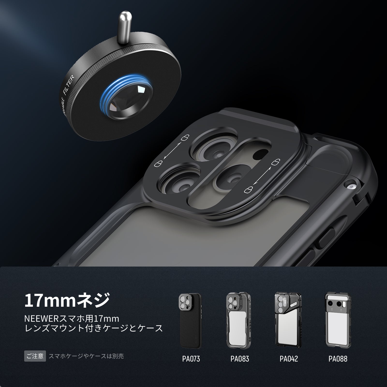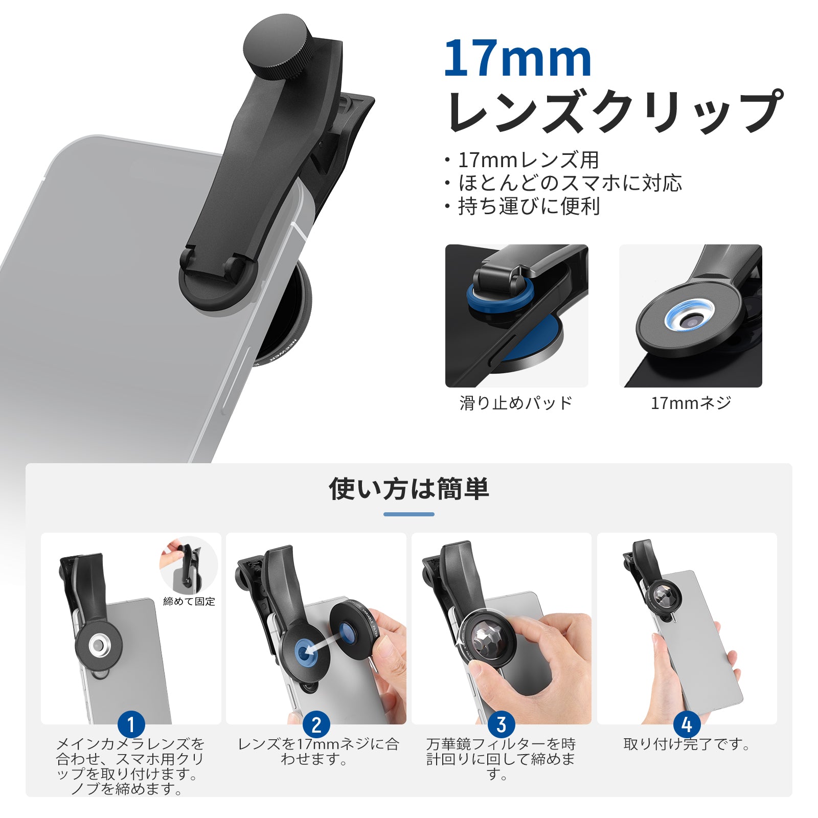 - 【17mmネジ付きスマホクリップ】17mmネジ付きスマホクリップを付属しており、レンズフィルターをiPhone/Android用スマホホルダー、ケース、バックプレートに取り付けられます。モバイル写真や動画撮影の質感を高め、コンテンツクリエイターやインフルエンサーにとって必要なギアとして、スマホカメラアクセサリーとしても活躍します。
