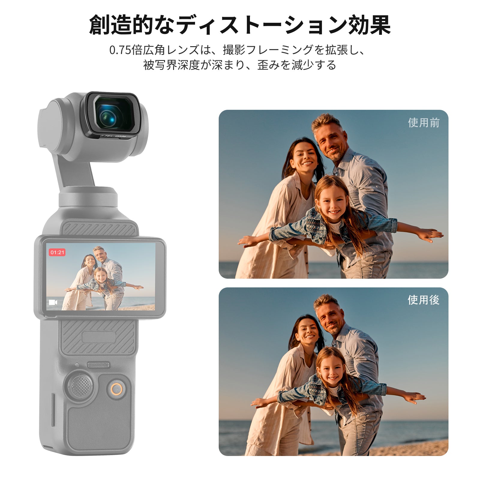 - 【0.75倍108°広角レンズ】視野角(FOV)を108°に拡大し、より広い範囲とより多くの被写体をフレーム内に捉え、わずかなエッジ歪みも抑えています。没入感あふれる創造なストリートフォト、自然風景、都市風景、建築物、グループショットなど、コンテンツクリエイターにとって必要なジンバルアクションカメラアクセサリーであり、インフルエンサーにとって必要な撮影機材です。