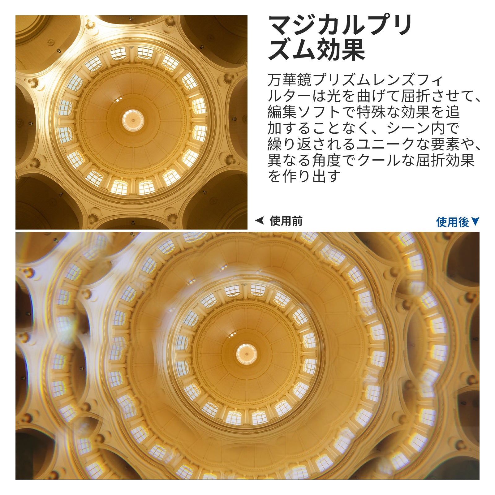 - 【マジカルプリズム効果】万華鏡プリズムレンズフィルターは、光を曲げたり屈折させたりして、編集ソフトウェアを使用して特殊な効果を追加することなく、シーン内で繰り返されるユニークな要素と、さまざまな角度でクールな屈折効果を作成します。