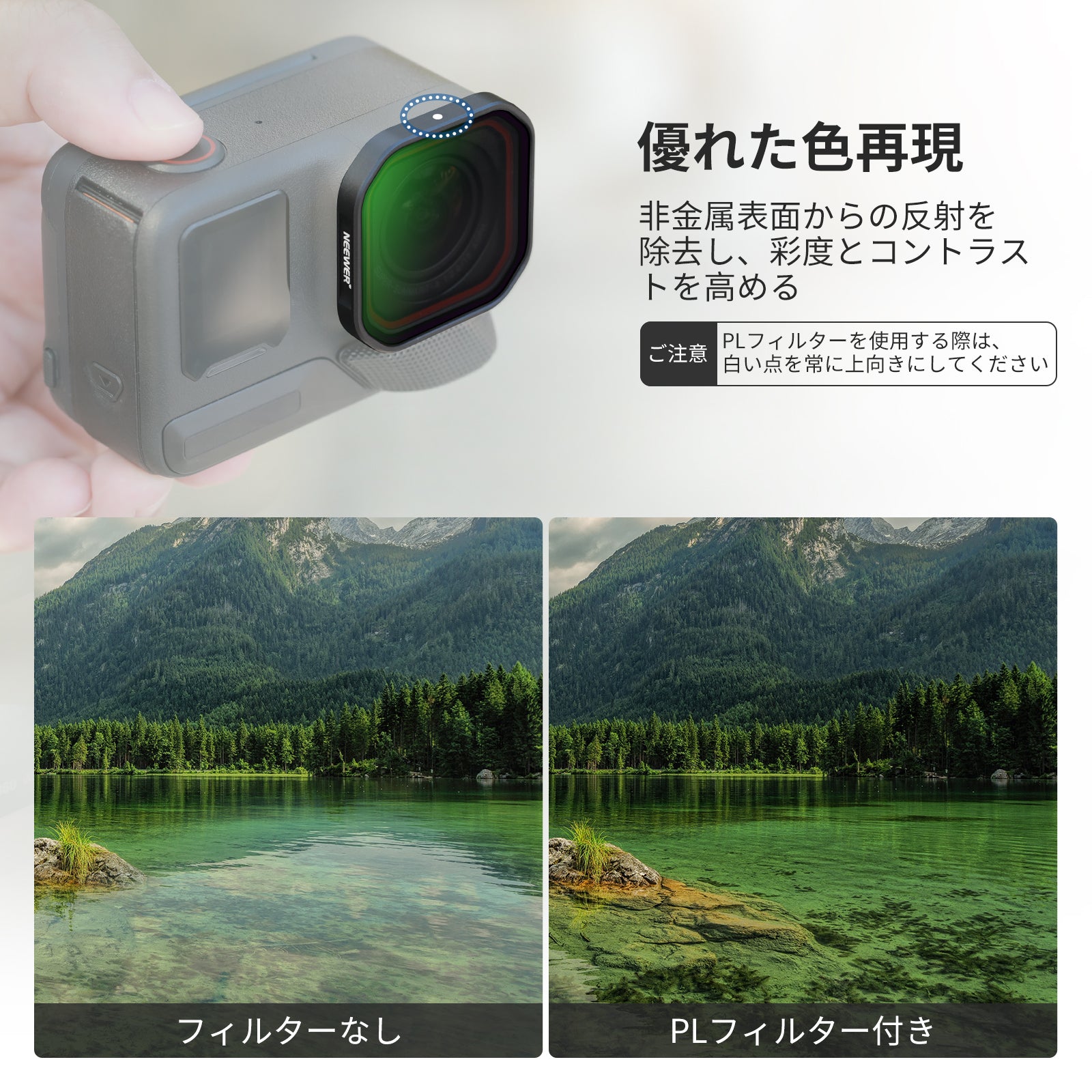 - 【彩度とコントラストを強化】偏光フィルターは、ガラスや水などの非金属表面での反射を最小限に抑え、鮮やかな色の彩度とコントラストを向上させます。ご注意:PLフィルターを使用する際は、常に白い点を上に向けてください。
