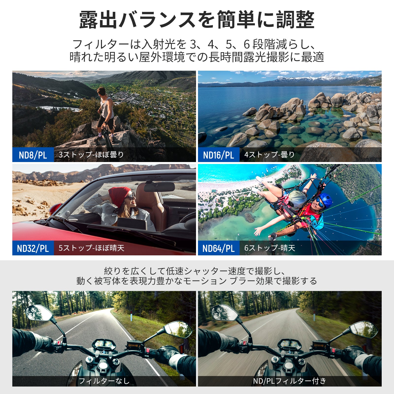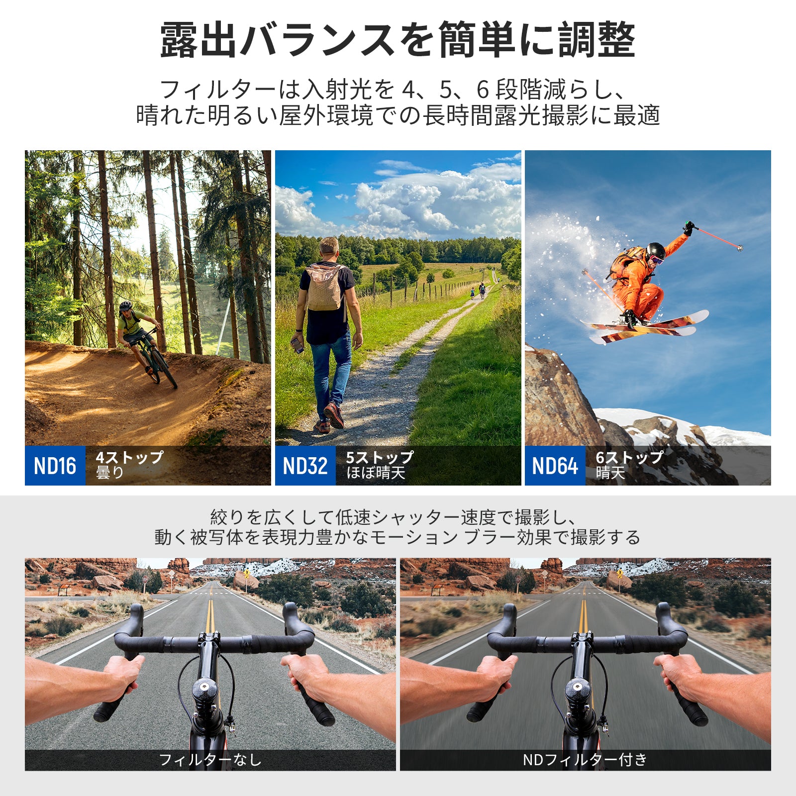 - 【優れた露出画像】ND16、ND32、ND64フィルターは、それぞれ4、5、6ストップの減光効果があり、明るい日差しの下での長時間露光撮影に最適です。フィルターにより、大口径で遅いシャッタースピードでの撮影が可能になり、ダイナミックなモーションブラー効果で動く被写体を捉えます。