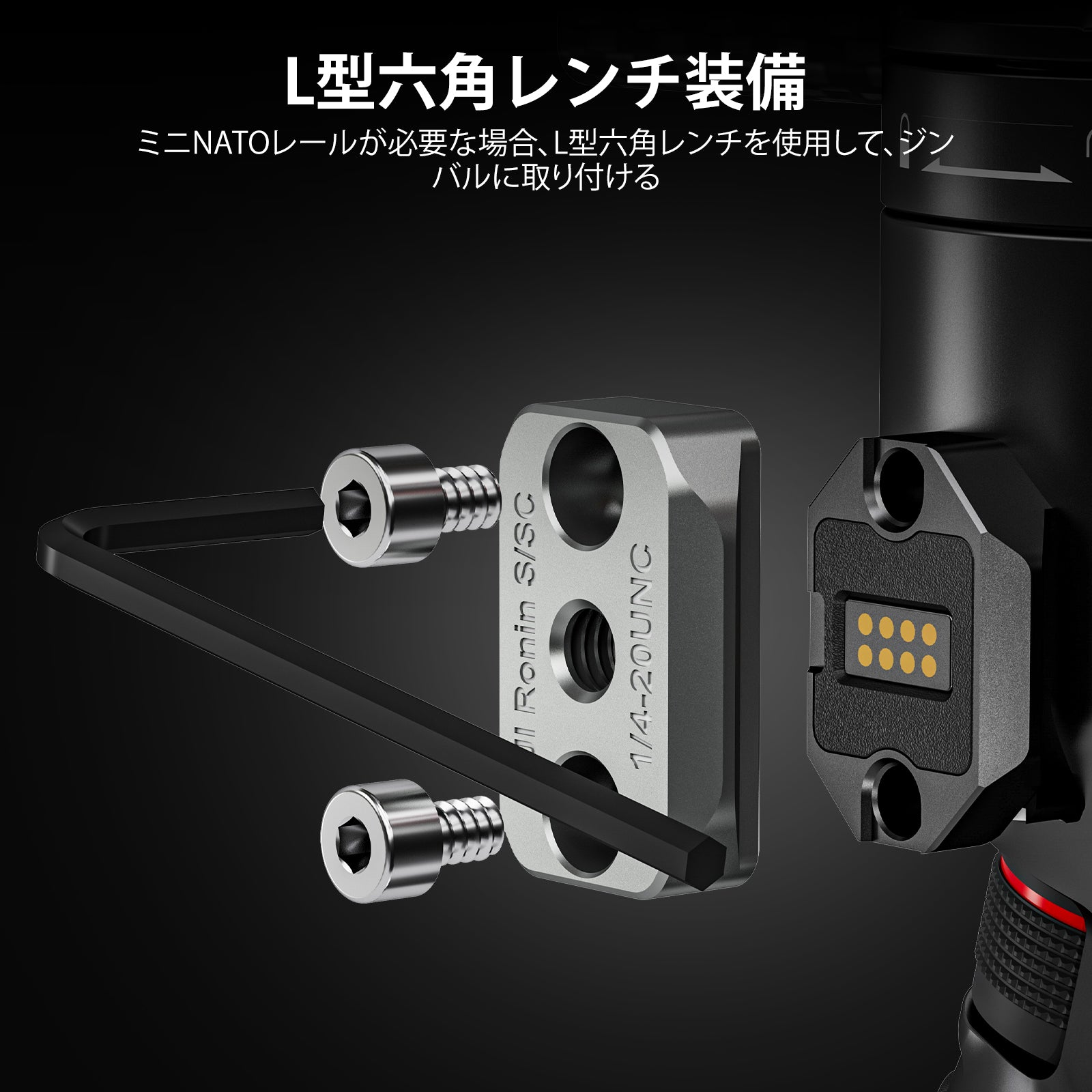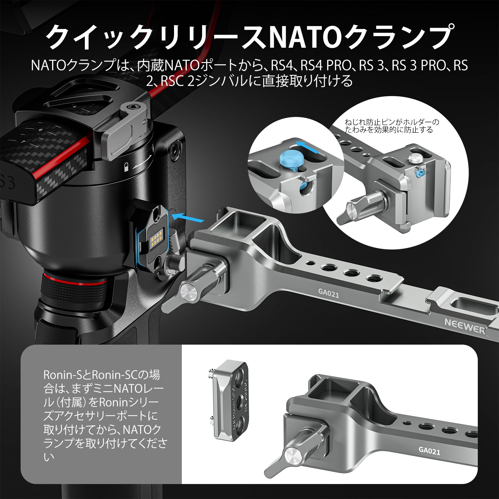 - 【クイックリリースNATOクランプ】NATOクランプは内蔵NATOポートから、RS4、RS4 PRO、RS 3、RS 3 PRO、RS 2、RSC 2ジンバルに直接取り付けることができます。Ronin-SとRonin-SCの場合は、まずミニNATOレール(付属)をRoninシリーズアクセサリーポートに取り付けてから、NATOクランプを取り付けてください。ねじれ防止ピンがホルダーのたわみを効果的に防止します。