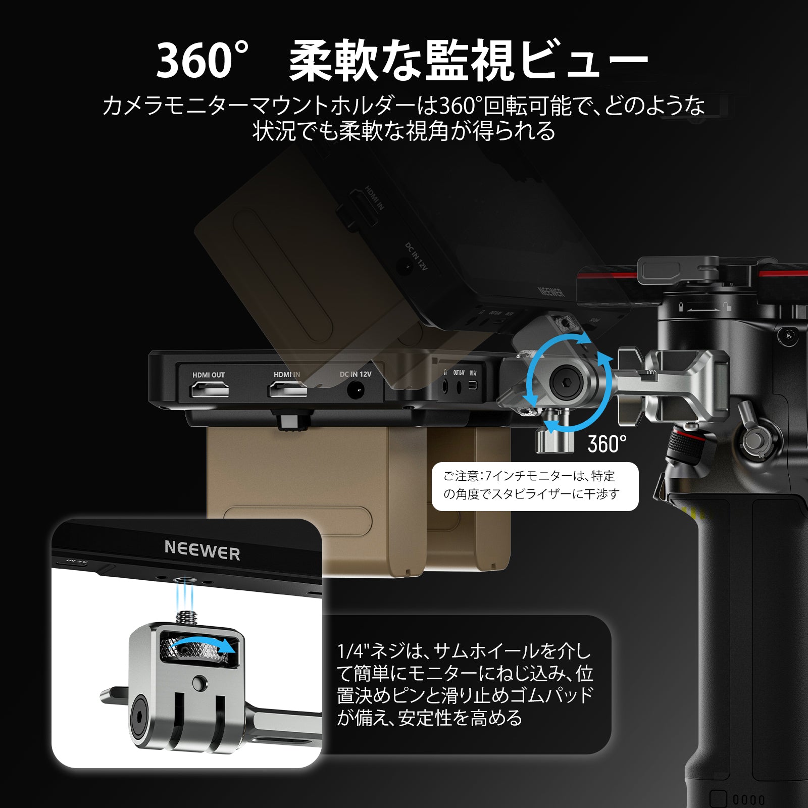 - 【コンパチブル RSスタビライザー】フィールドモニターマウントホルダーはコンパチブル RSとRoninジンバルスタビライザー。1.5kgの耐荷重で、様々なカメラモニターをしっかりと支えます。