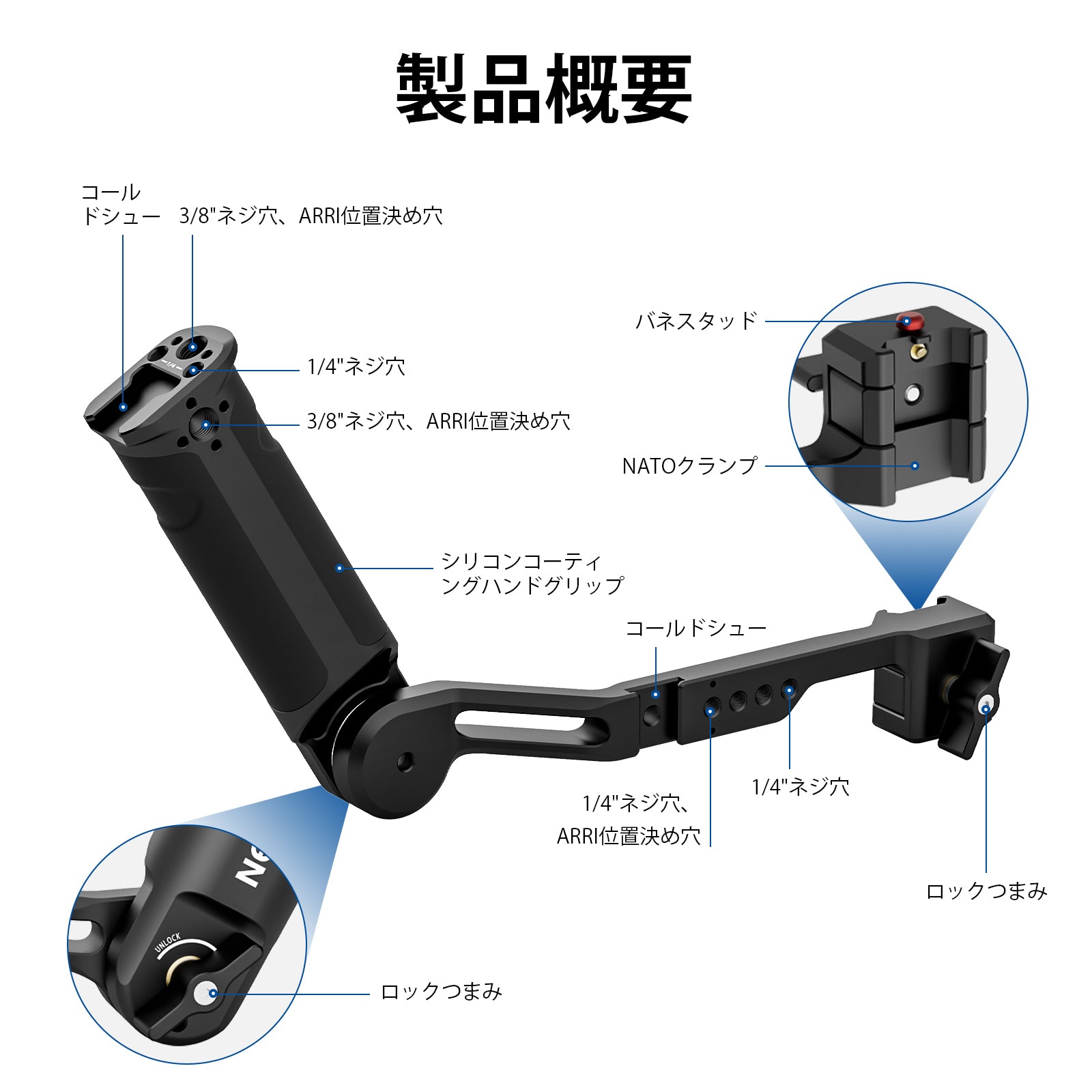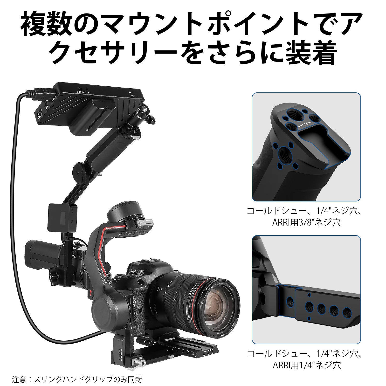 【複数の取り付けオプション】スリンググリップには、複数の1/4"と3/8"ネジ穴、ARRIピンに対応できる位置決め穴、2 つのコールド シュー アダプターが備えており、LEDライト、サウンドレシーバー、モニターなどさまざまなアクセサリーを取り付けることができます。