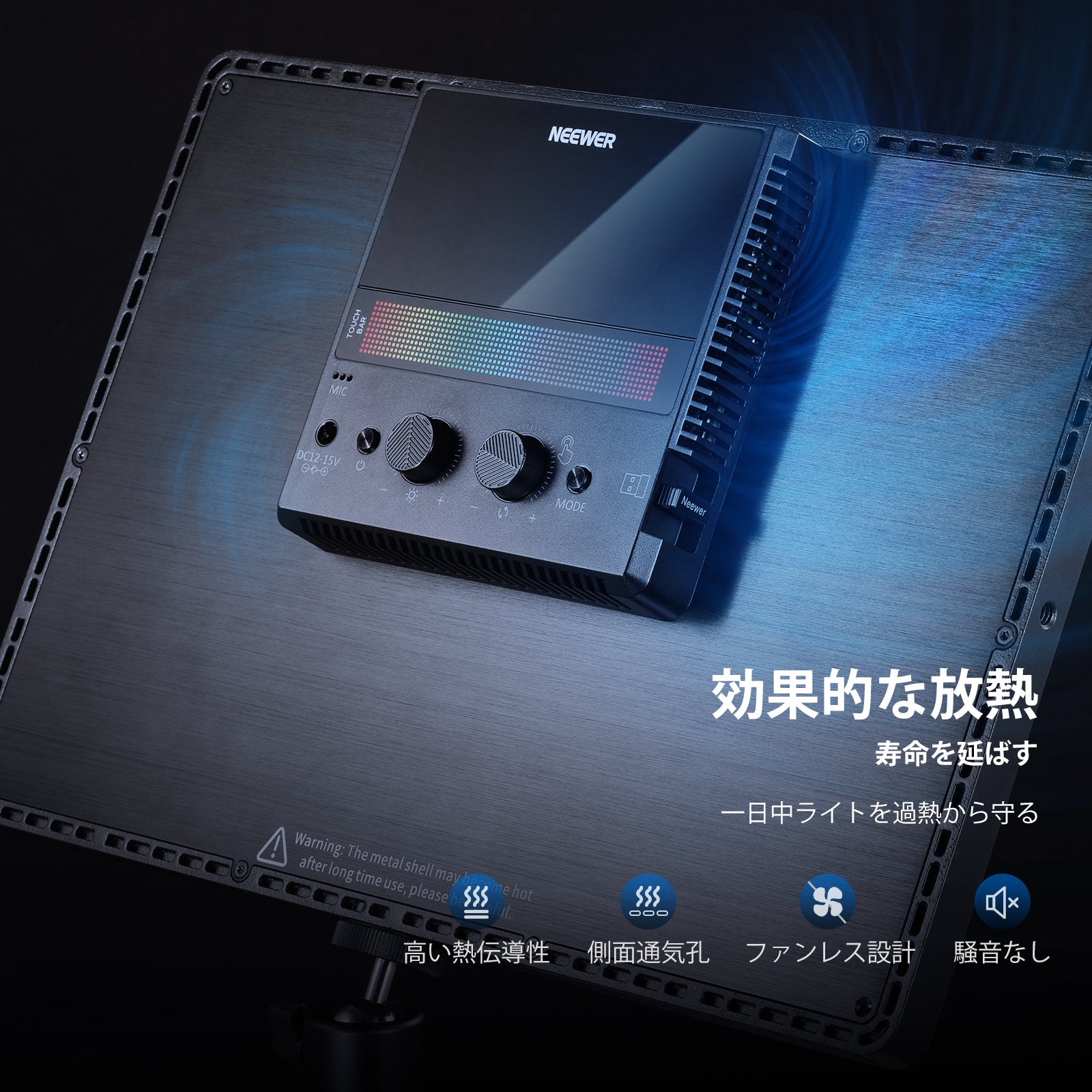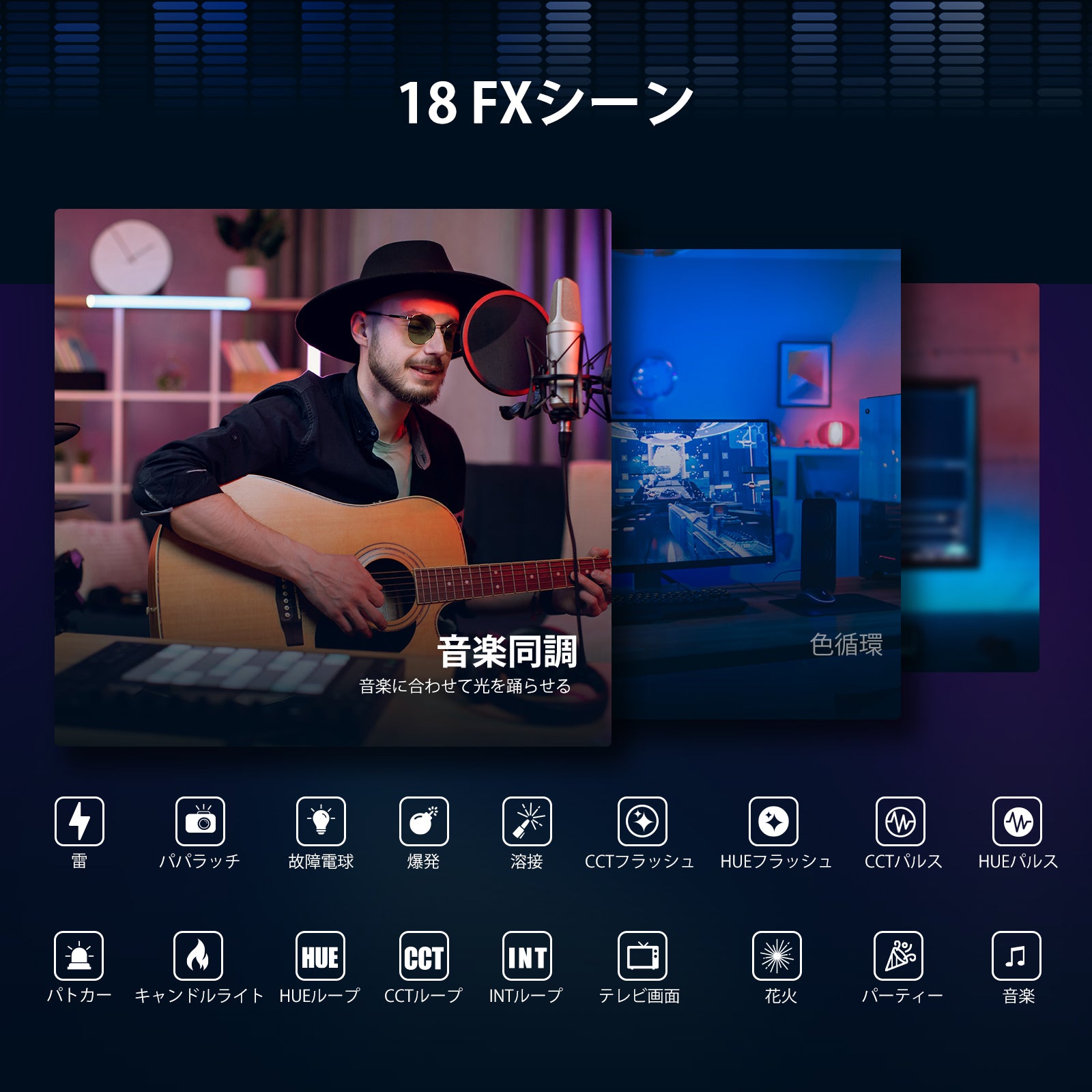 【フルカラータッチバー&18種特別なシーン】RGBWW ライトミキシングにより、2900K~7000Kの色温度調整と±50 GMの色補正が可能になり、HSI モードでは、色相、彩度、強度を個別に調整して36000色を実現できます。18種類のFX シーン効果には、リズムに合わせて照明を「ダンス」させる音楽同期モードが含まれています。コントロールパネルは使いやすく、アップグレードされたタッチバーにより、指を滑らせるだけでカラーを選択できます (「NEEWER」アプリはカラーピッカーをサポートしています)。