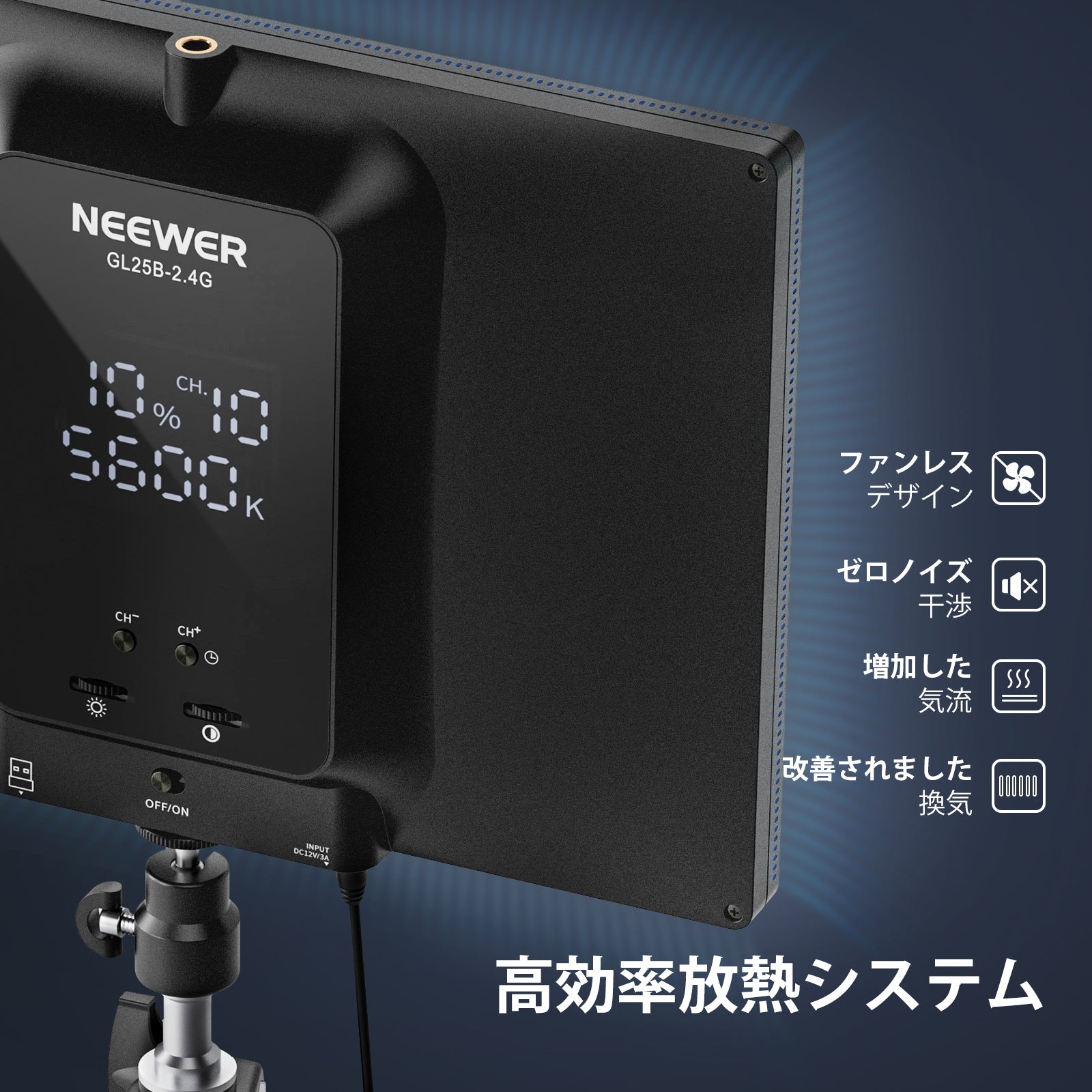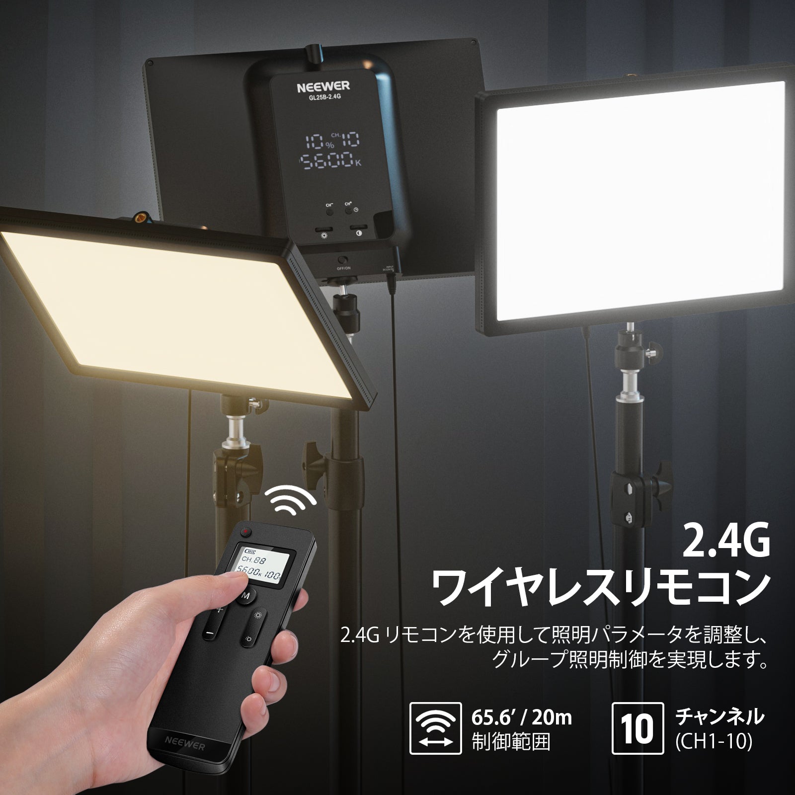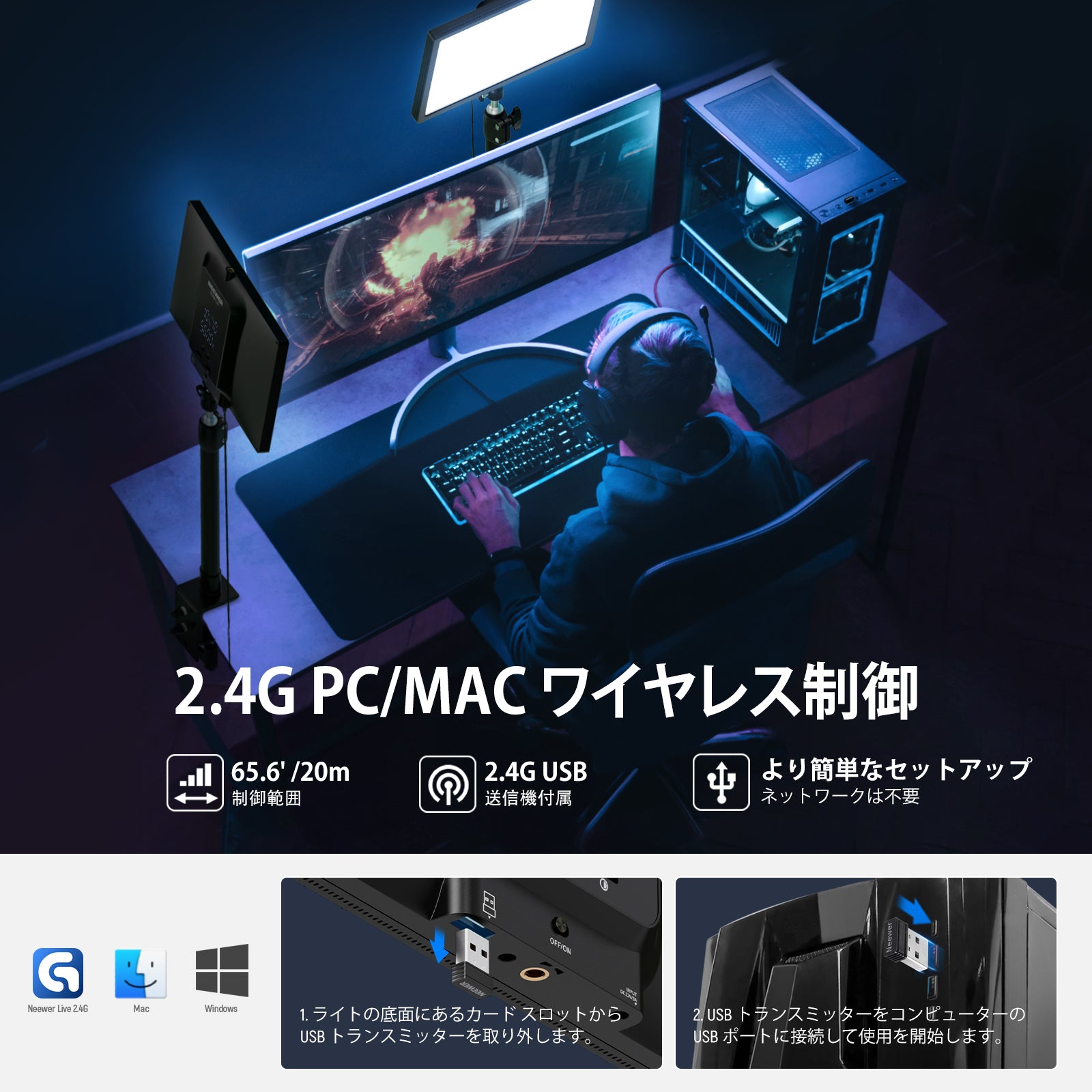 【2.4Gリモート&PC/MAC制御】パネル上の制御ボタンに加えて、付属のRT100 リモコンを使用して、1つまたは複数のライトをワイヤレスで制御できます。ライトパネルから2.4G USBトランスミッターを取り外し、WindowsまたはmacOS ラップトップ/コンピューターに接続し、NEEWER Live 2.4G APPをダウンロードすると、インターネットなしで簡単に照明を制御できます。GL1、GL1 Pro、GL1-C、BH40B、RP16、SRP18、RP18H、T140 NL1920/660/480-2.4G、CL124-2.4Gなどの他のNEEWERライトでも動作します。