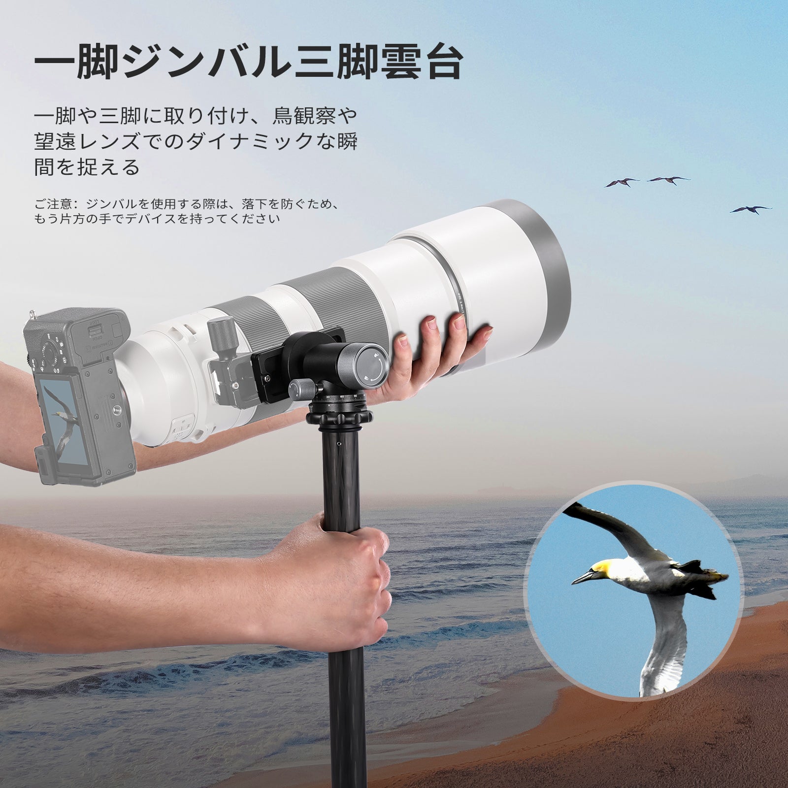- 【鳥観察一脚ジンバル雲台】鳥を追ったり、望遠レンズでダイナミックな瞬間を撮影するために、ジンバル雲台は一脚に取り付けても最適なバランスを保つことができ、ボール雲台で水平方向から垂直方向に調整してもブレのない安定した映像を提供します。