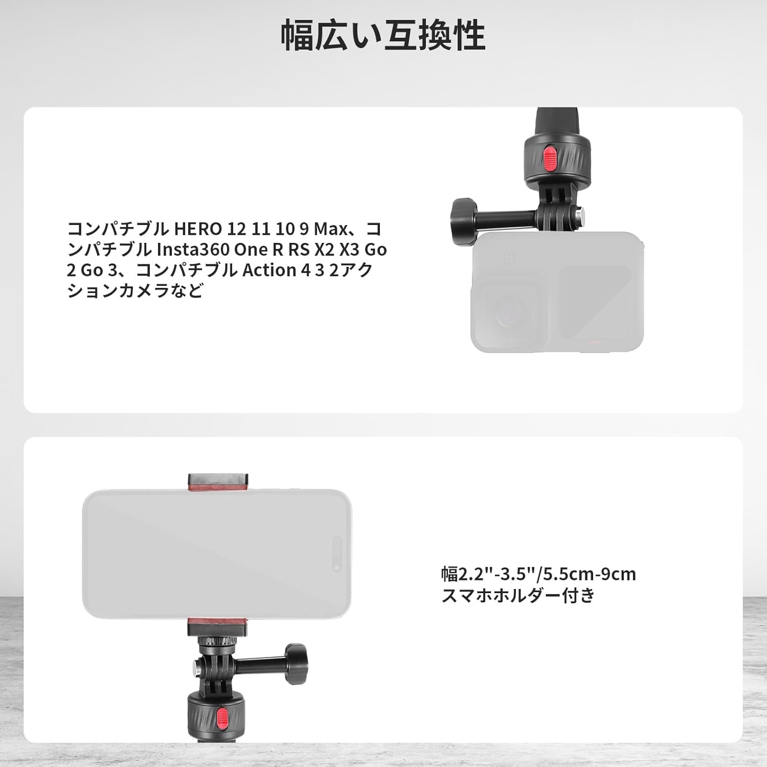 - 【幅広い互換性】NEEWER GP-17は標準クイックリリースマウントアダプターで設計され、コンパチブル Hero13 12 11 10 9 8 7 Black Max、コンパチブル Insta360 One RS X2 X3 x4 Go 3 insta 360 ace pro、コンパチブル DJI Action 5 Pro 4 3 2アクションカメラ, AKASO brave 8 7 4 combosなど。幅2.2"-3.5"(5.5cm~9cm)のスマートフォン用のスマホクランプマウントを付属し、コンパチブルiPhone 16 15 Pro Max Plus 14 13 12 Samsung Galaxy S24 S23 S22 Ultra Google Pixel 9 8 7 Proおよび他のスマートフォン。