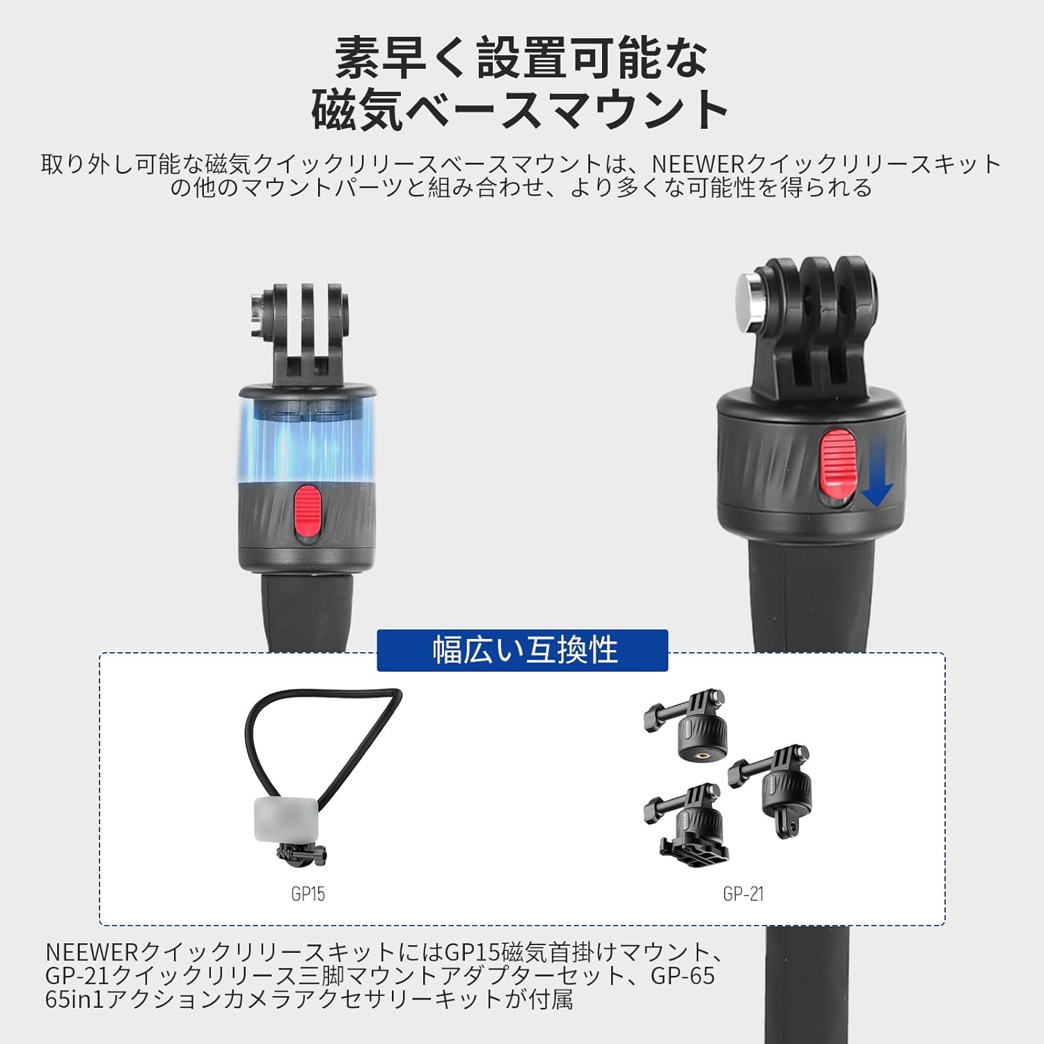 - 【磁気ベースマウントで素早くセットアップ】フレキシブルチューブの上部にあるマグネット式クイックリリースベースマウントは取り外し可能で、NEEWERクイックリリースキットの他のマウントパーツとクリエイティブに組み立てることで、より多くの可能性を可能にします。NEEWER GP15 マグネットネックマウント、GP-21 クイックリリース三脚マウントアダプターセット、GP-65 65 in 1 アクションカメラアクセサリーキットが含まれます。