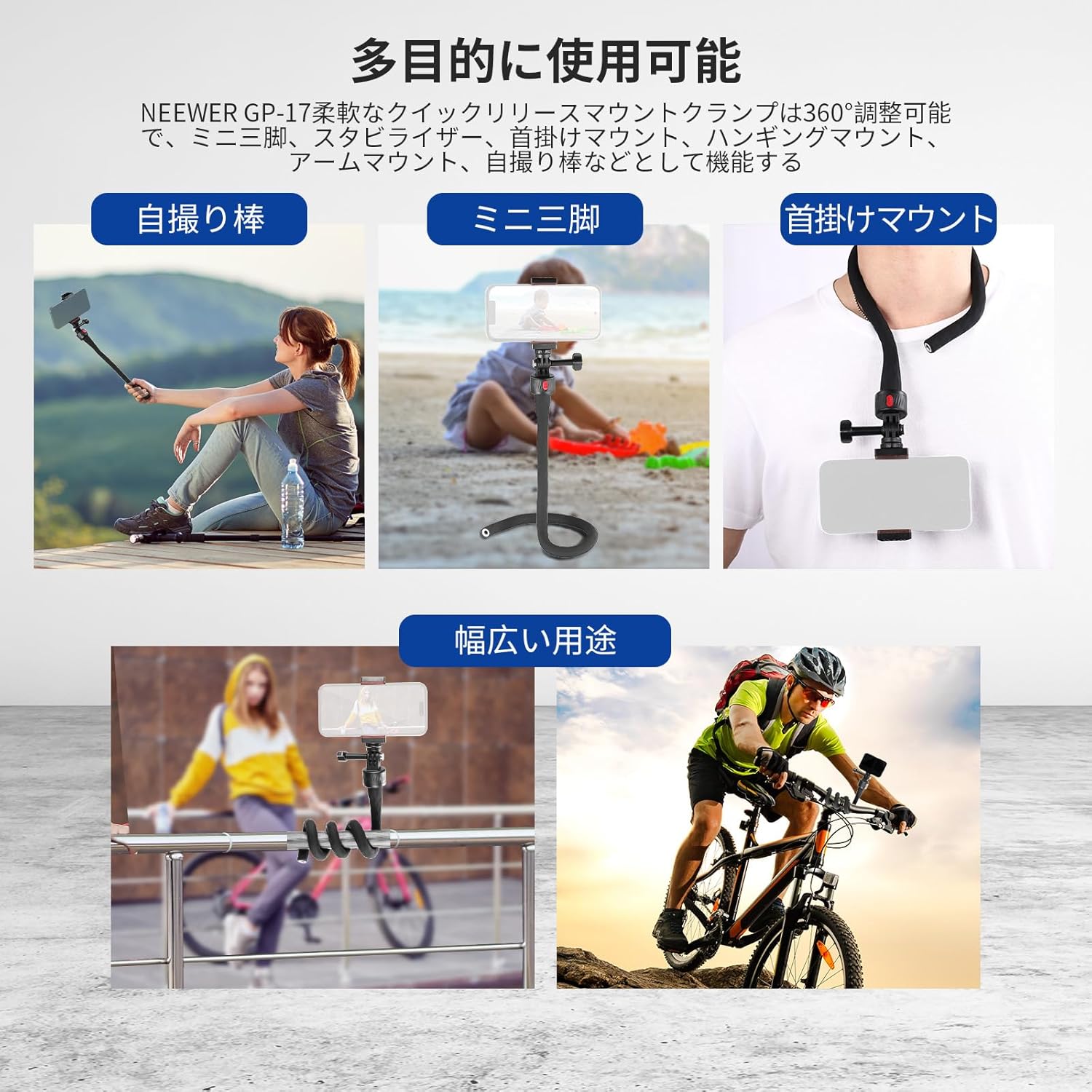 - 【多目的に使用可能】NEEWER GP-17は柔軟なカメラマウントで、撮影の可能性を無限に広げます。シリコンロッドを曲げたり回転させたりして、自転車やオートバイのハンドルバー、車のヘッドレスト、ショッピングカート、ベビーカー、スピンバイク、トレッドミル、木、柱、レール、その他無数のアイテムなど、あらゆる表面に巻き付けて簡単に使用できます。両手が自由になり、思いがけない撮影アングルが得られます。