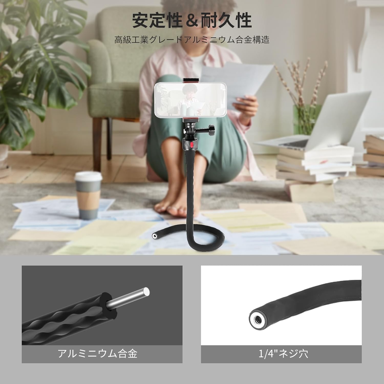 - 【安定性&耐久性】ハンドフリーカメラマウントは高級なアルミニウム合金で作られ、長期的なサービスを提供し、300gまでのデバイスをしっかりと保持しながら、必要に応じて任意の方向に曲げることができる超柔軟性を提供します。