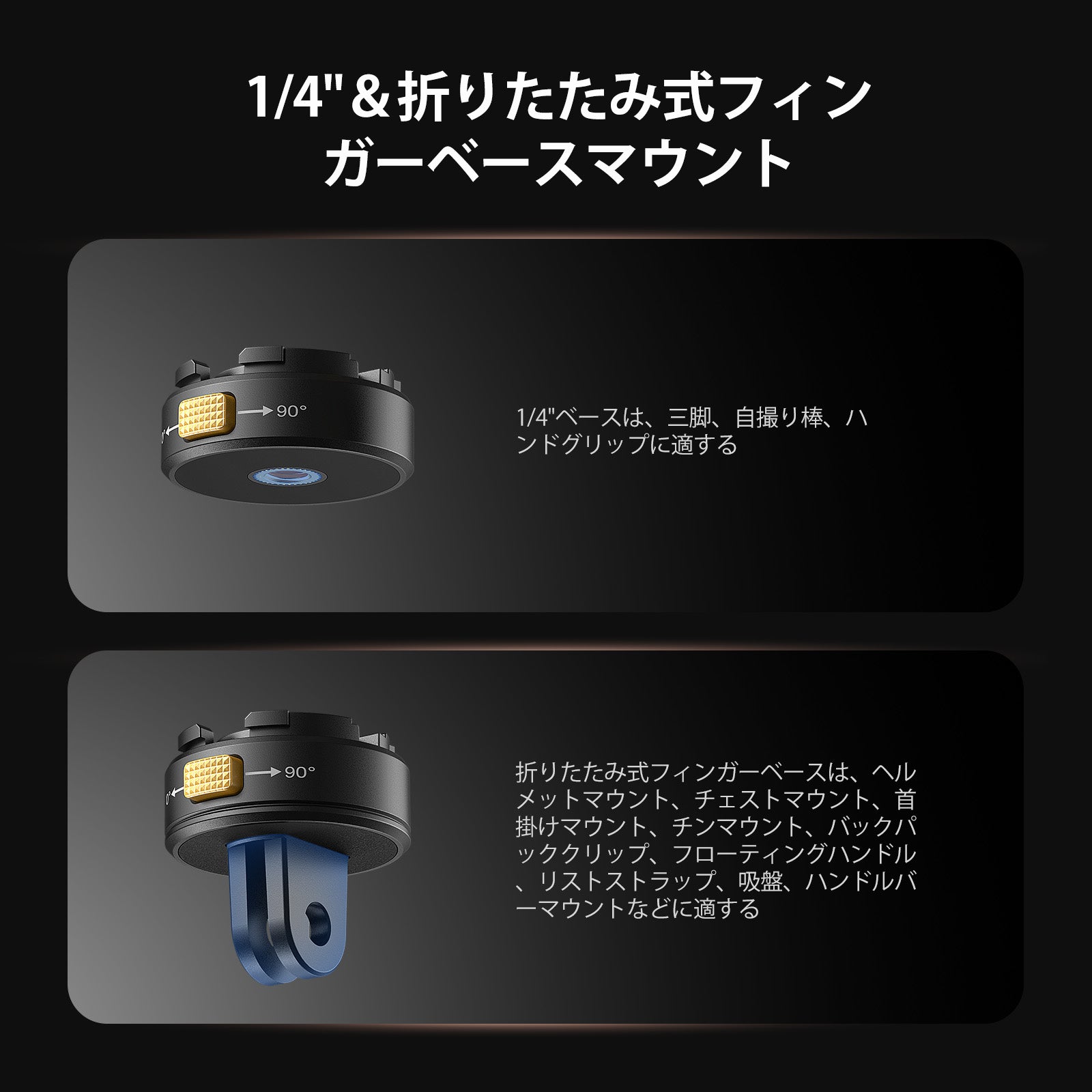 - 【1/4"&折りたたみフィンガーベースマウント】1/4"ベースマウントは、三脚、自撮り棒ポール、ハンドグリップに適用です。折りたたみフィンガーベースマウントは、ハンズフリーヘルメットマウント、チェストハーネスマウント、ネックレス式マウント、ヘッドマウント、チンストラップマウント、バックパック/ハットクリップ、フローティングハンドルグリップ、リストストラップ、吸盤ホルダー、ベビーカー/バイク/自転車ハンドルバーマウントに取り付けることができます。