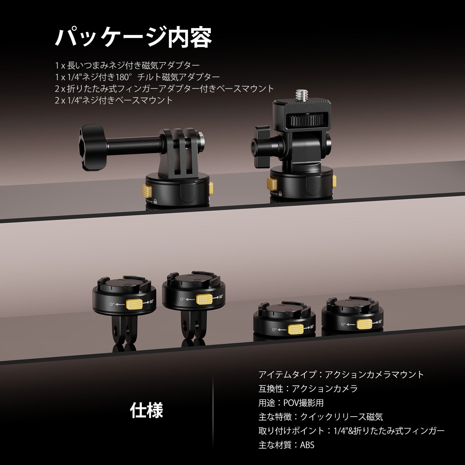 - 【4In1アクションカメラアダプターキット】アクションカメラマウントアダプターキットには、長いつまみネジ付き磁気アダプター×1、1/4"ネジ付き180°チルト磁気アダプター×1、折りたたみ式フィンガーアダプター付きベースマウント×1、1/4"ネジ付きベースマウント×1が含まれています。
