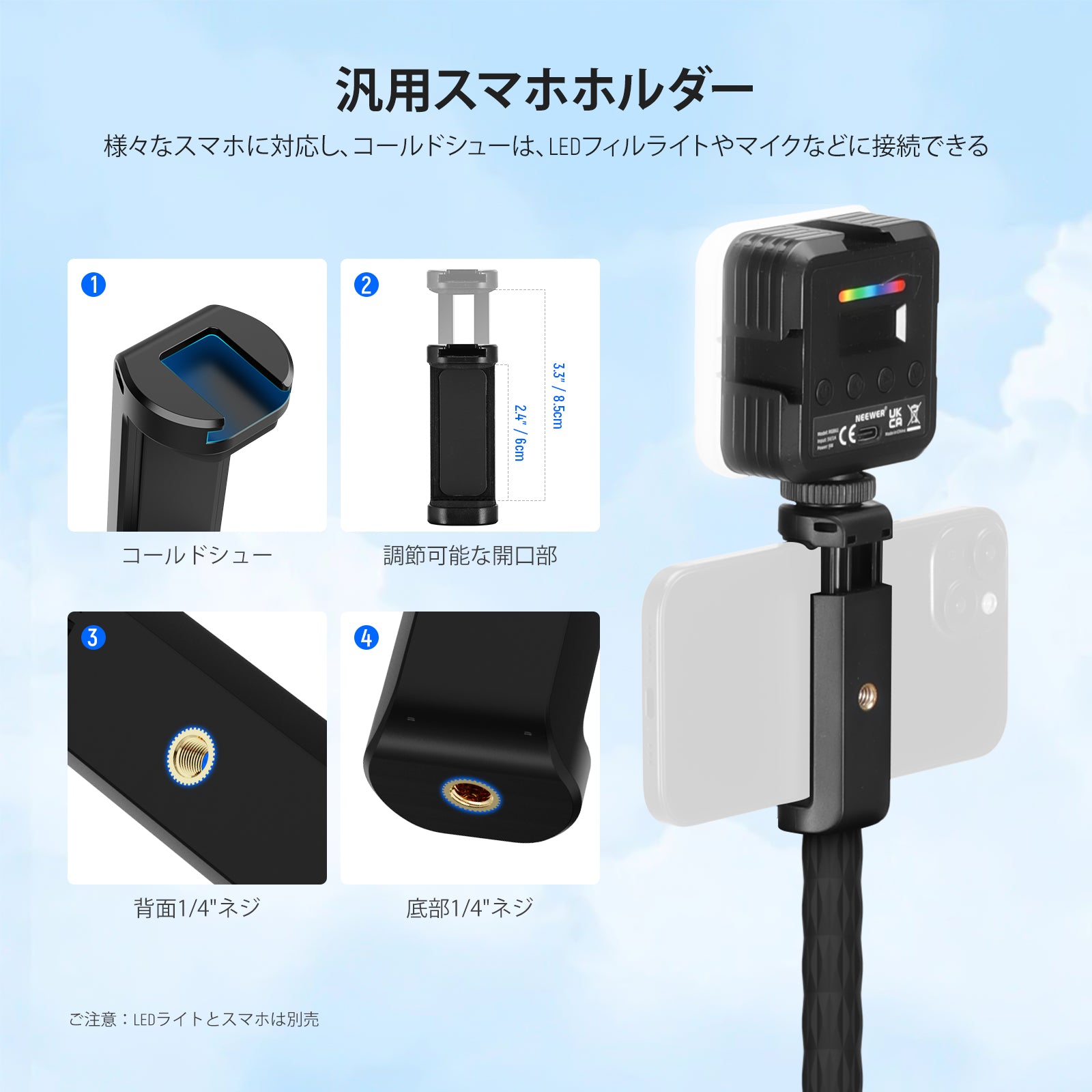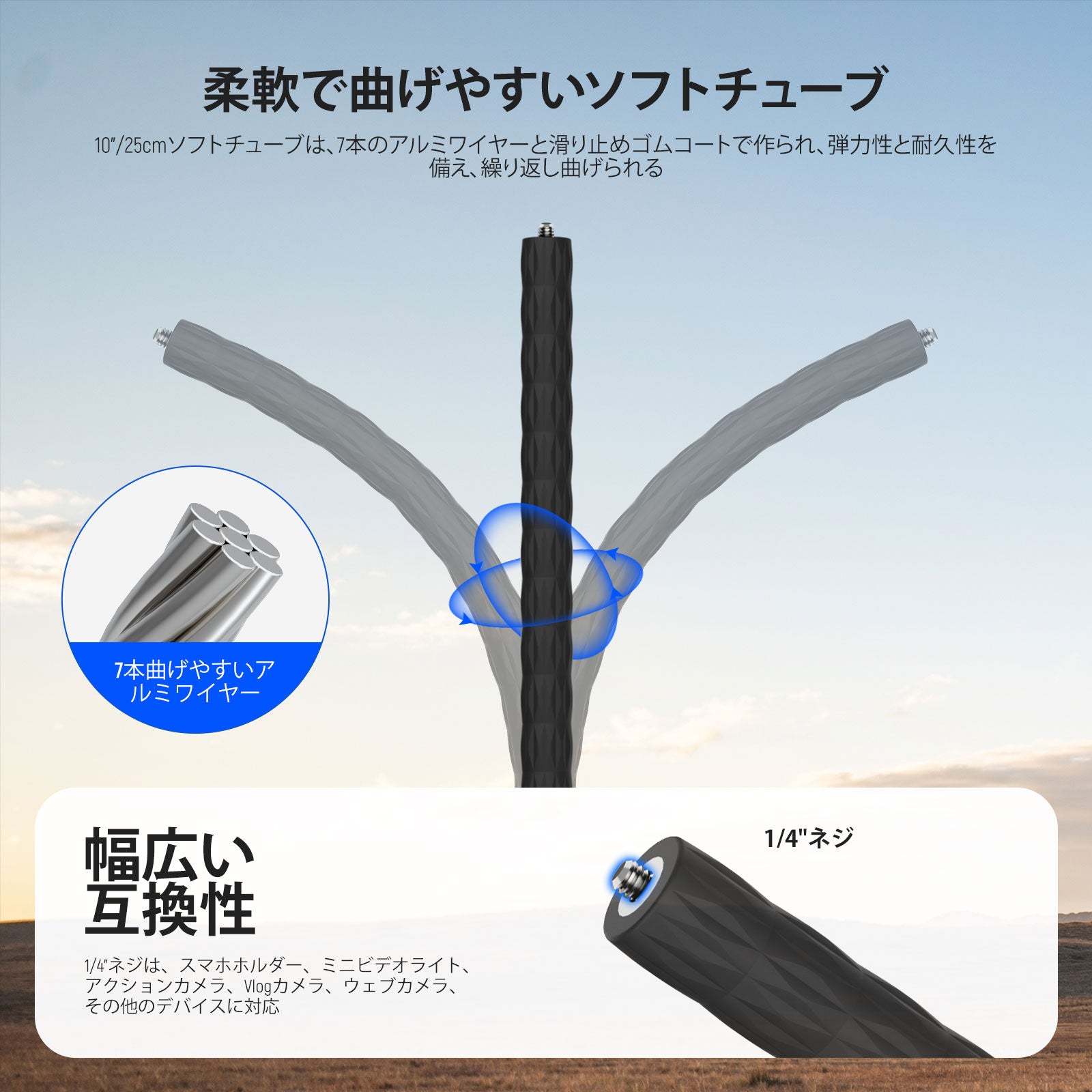 - 【柔軟で曲げられるソフトチューブ】10"/25cmソフトチューブは、7本のアルミロッドと滑り止めゴムコーティングで作られており、強い弾性と耐久性を備え、繰り返し曲げられます。1/4"ネジは400gまでのアクションカメラやスマホ三脚マウントに幅広い対応します。