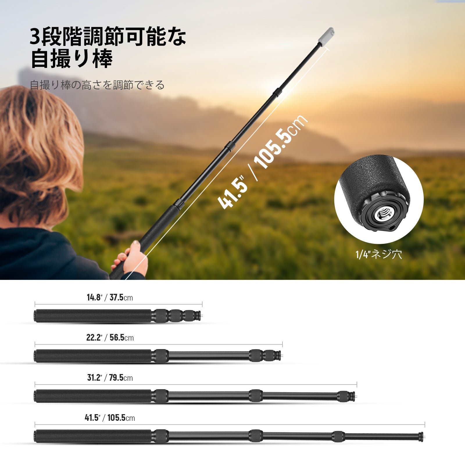 - 【高さ&角度調整可能】4つのセクションからなる伸縮ロッドを14.8cmから41.5cmまで伸ばし、マジックアーム上の2つの360°回転可能なボールヘッドを調整するだけで、撮影の柔軟性を最適化できます。ネジノブでボールヘッドを固定し、走行中のカメラ位置を安定させます。