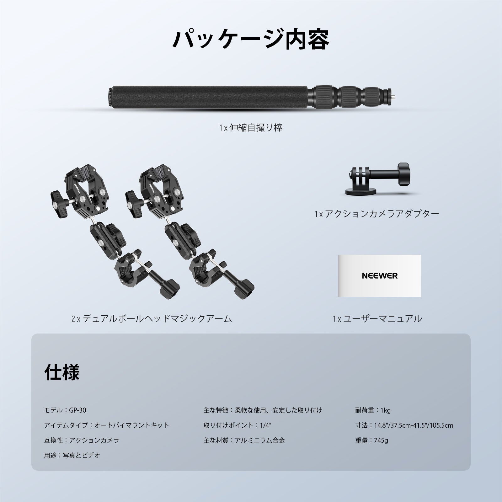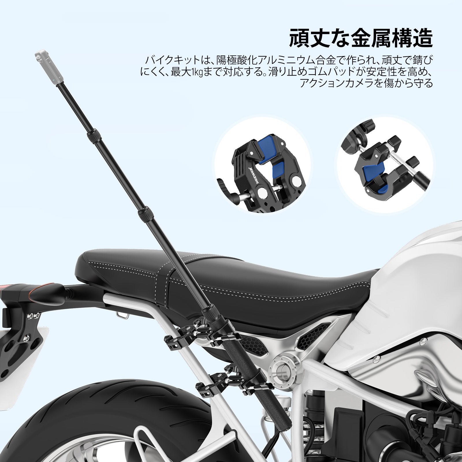 - 【バイクカメラマウントキット】アクションカメラハンドルバーマウントキットは、伸縮自撮り棒、2つのデュアルボールヘッドマジックアーム、アクションカメラアダプターで構成され、外出先で印象的なPOVショットをキャプチャします。自撮り棒の1/4"トップネジを使用して、自転車やバイクのハンドル、ゴルフバッグやカートにアクションカメラを取り付けることができます。