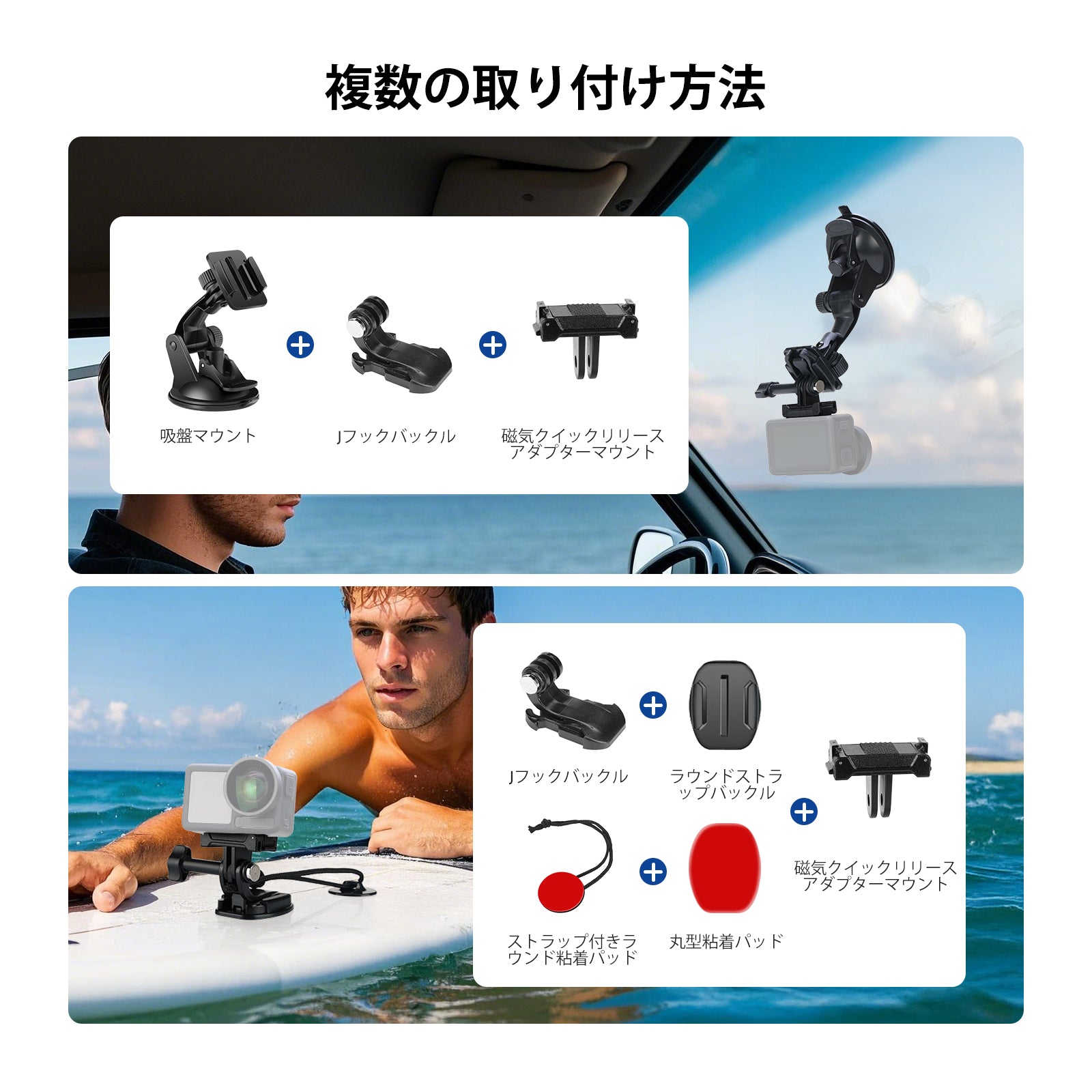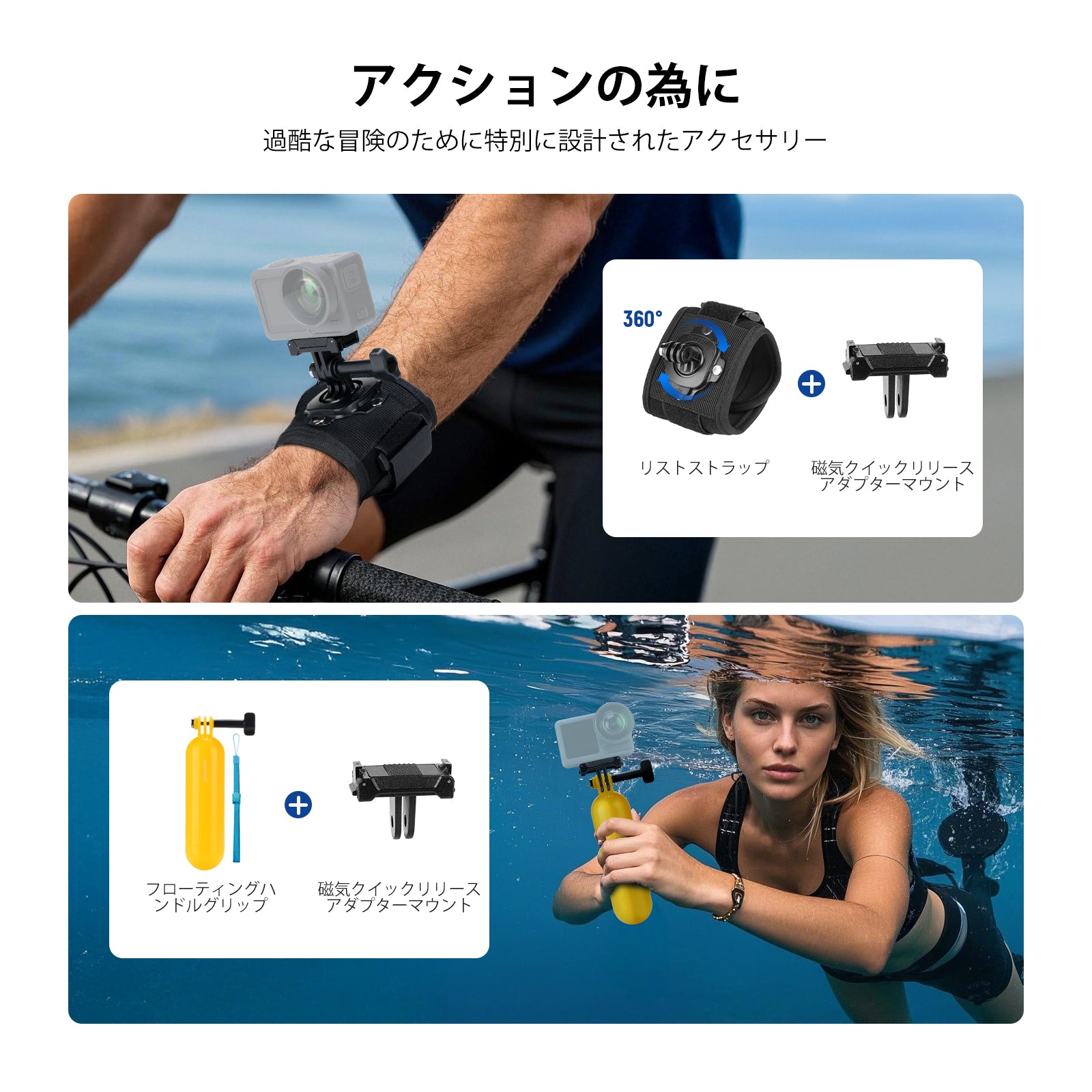 - 【水中スポーツ用】防水フローティングハンドルグリップとクイックリリース磁気マウントを使用して、水中ダイビングやフラットトリップ写真撮影を行います。フローティングハンドルは、コンパチブル GoPro、自撮り棒として水泳やシュノーケリング時に水中で安定した状態でカメラを浮かせます。丸型ベース、粘着パッド、ストラップバックル、Jフックバックル、クイックリリースマウント、ストラップアクセサリーを使用して、アクションカメラをサーフボードに安全に取り付け、を離して没入感を共有できます。