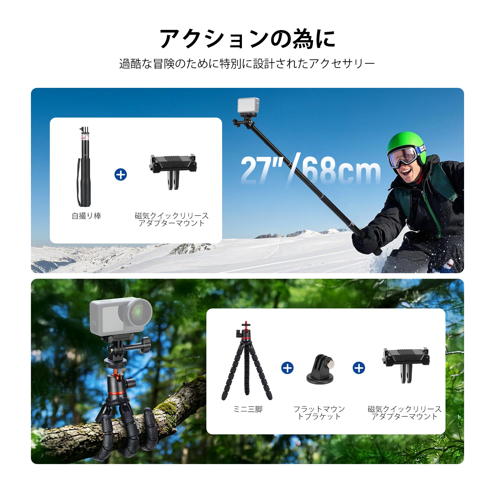 【スキーキット&アクションカメラマウントアダプター】自撮り棒とヘッドストラップでスノーボードなどのスポーツの素晴らしい景色を撮影できます。自撮り棒のポールは最大27"/68cmまで伸び、ヘッドストラップはカメラを頭や帽子に固定し、サーフィン、スケートボード、パラシュート、バンジージャンプなどのPOV撮影をできます。アクセサリーパックには、アダプターが含まれ、コンパチブル GoPro Hero 13 12 11 10 9 8 7 Black Go Pro Max DJI osmo pocket 3 Insta360 X4 X3 Insta 360 Ace Pro、またはiPhone用スマホホルダーも付属しています。