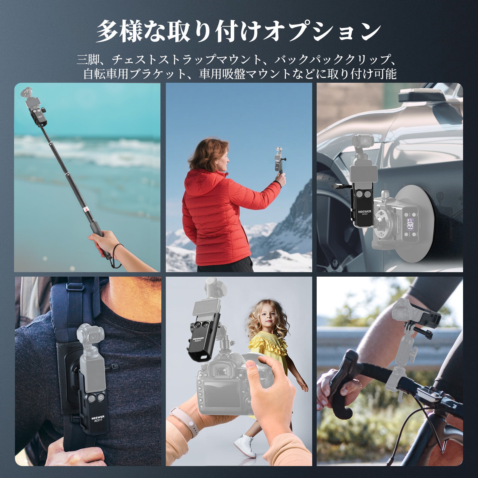 - 【Pocket 3用Vlog自撮りキット】NEEWER GP-59ジンバルカメラケースマウントアクセサリーキットには、コンパチブル DJI Osmo Pocket 3とそのCreator Combo、延長アダプターマウント、自撮り棒、T字型マウントボルトが含まれています。軽量で安定したソリューションは、ウォーキング/ランニングブログや日常自撮りに最適で、撮影範囲を広げながら、スムーズでプレミアム品質の撮影を保証します。コンテンツクリエイターの必需品として、またインフルエンサーの必需品として、YouTubeのVlog撮影に最適です。