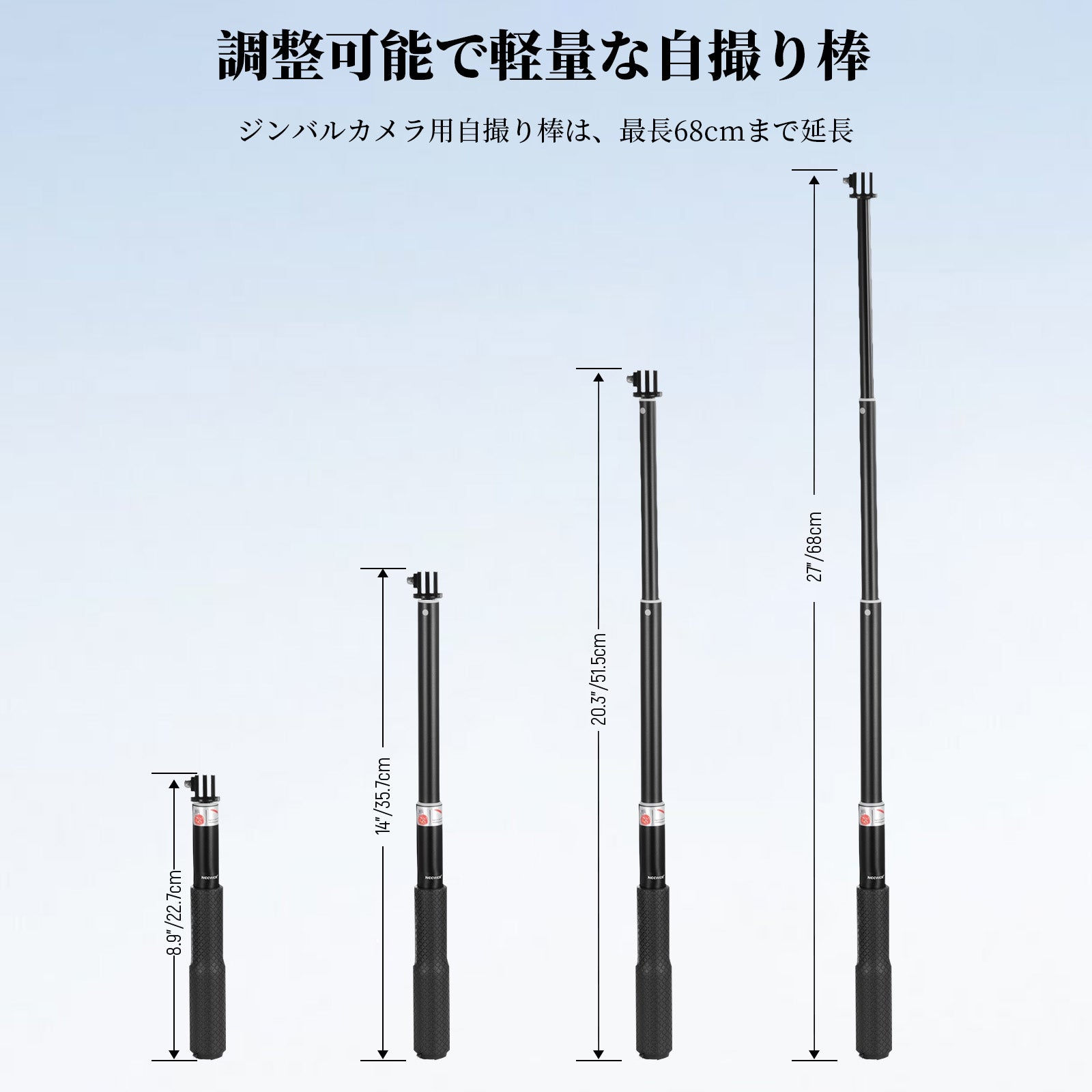 - 【調整可能と軽量な自撮り棒】ジンバルカメラ用自撮り棒は最大27"/68cmまで伸長し、広角撮影、集合写真、ダイナミックなアクション映像を簡単に撮影できます。写真撮影用ギアは、軽量とポータブルで、滑り止めゴムグリップを採用し、快適性が向上し、リストストラップが付属し、安全性が向上し、持ち運びが簡単です。