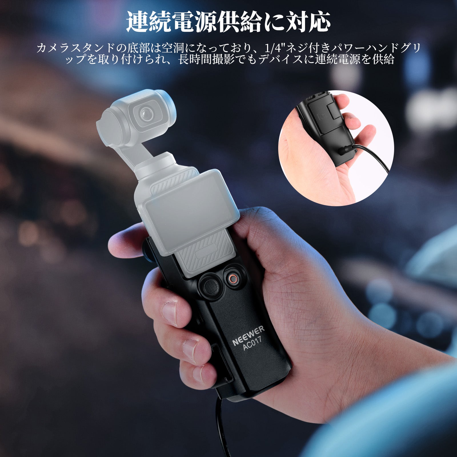 - 【バッテリーハンドルで連続使用可能】Pocketカメラアダプターマウントは底部が空洞になっており、バッテリーハンドルを取り付け、長時間撮影時に連続駆動が可能です。バッテリーグリップの1/4"ネジ穴は、自撮り棒から三脚や延長ポールへの容易な移動を可能にします。さらに、カメラの上部を遮らないため、ジンバルプロテクターやその他のアクセサリを使用できます。