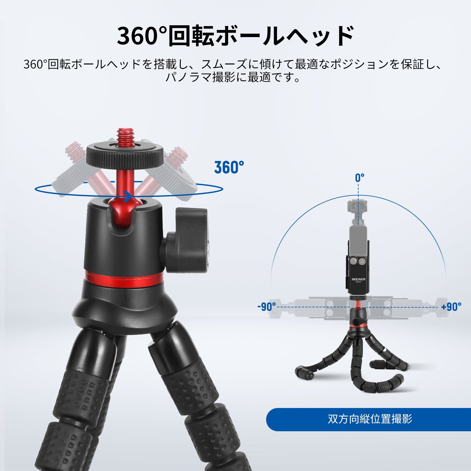 - 【ボールヘッド付きフレキシブルミニ三脚】ボールヘッドは360°回転調整が可能で、横向きと縦向きのモードを簡単に切り替えできます。手持ち撮影だけでなく、脚を曲げられる三脚スタンドは、平らな面にしっかりと立てたり、ポールや枝に巻き付けたりできるので、ダイナミックな角度からビデオ録画や写真撮影が簡単にできます。