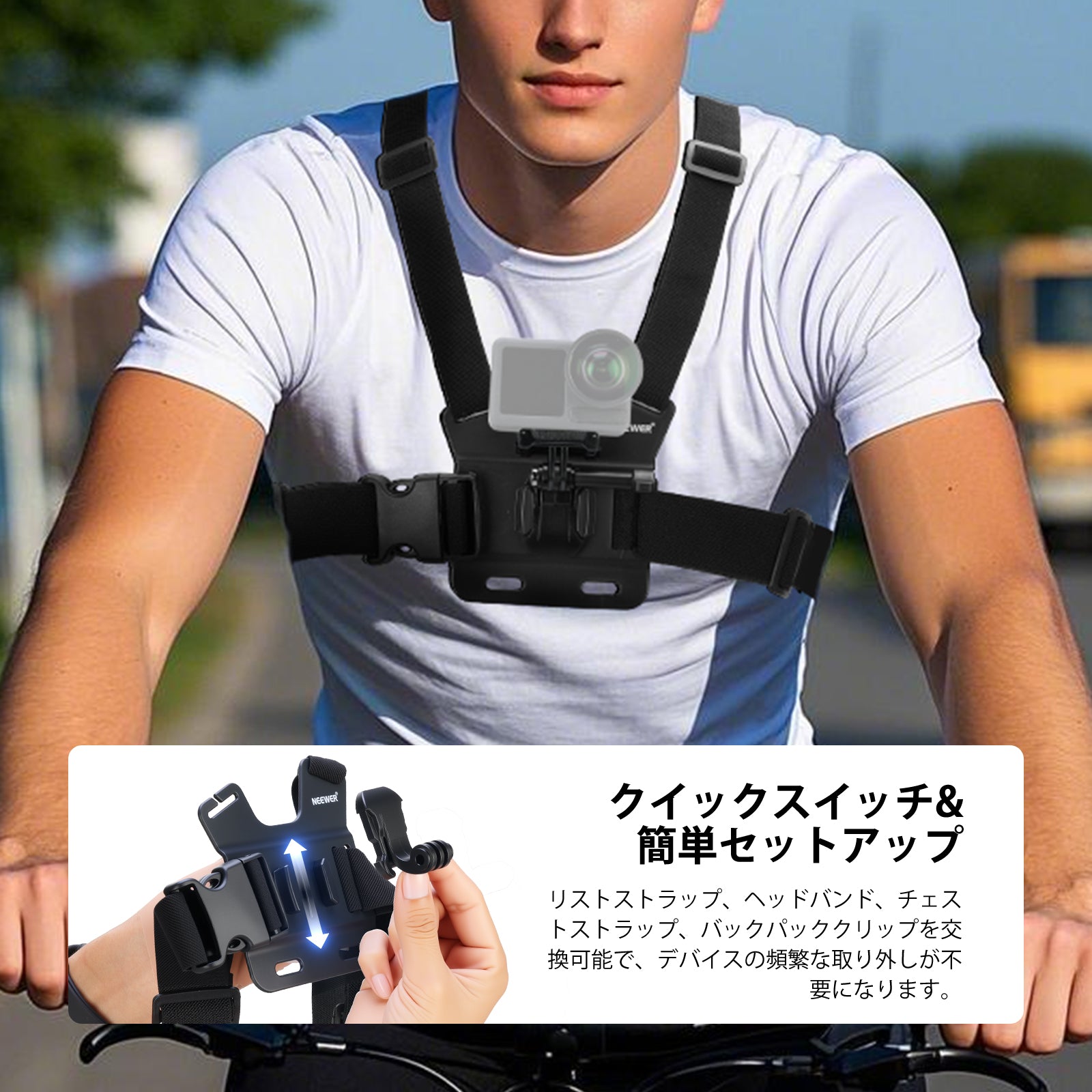 【軽量&快適なフィット感】織りストラップは通気性に優れ、軽量ながら丈夫です。様々な体型やサイズに合わせて調整可能で、長時間着用でも快適です。コンテンツクリエイターやインフルエンサーにとって必要なアクションカメラ撮影ギアとして最適です。