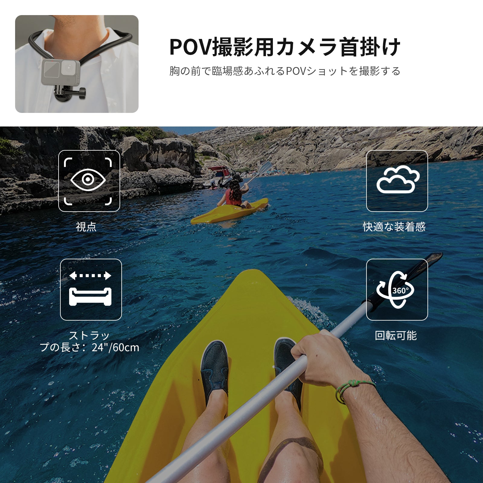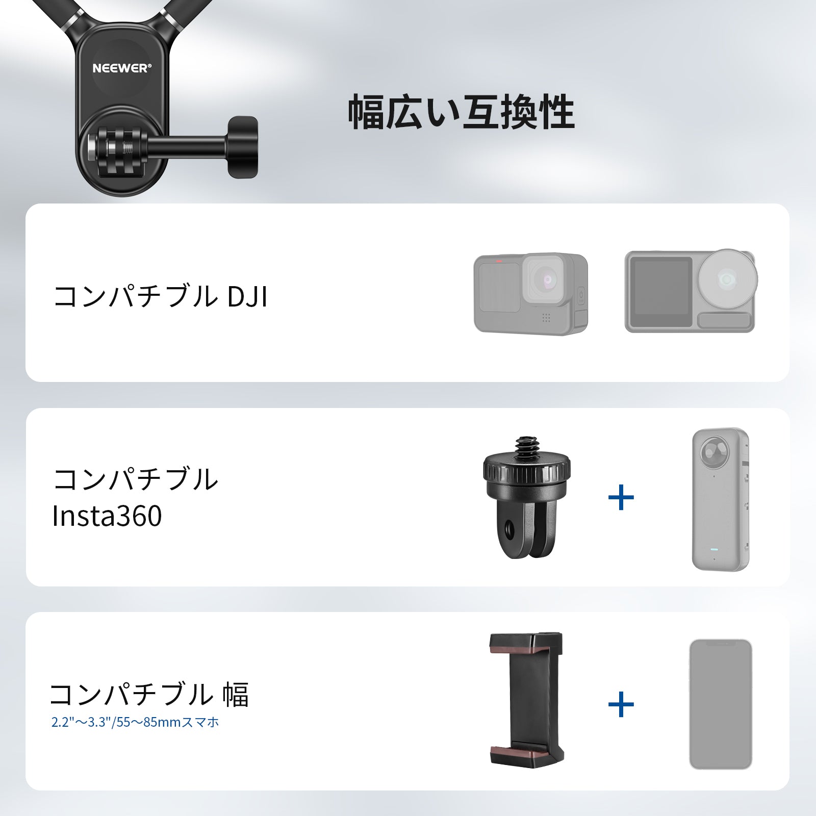 【視点(POV)用ネックマウントホルダー】NEEWER GP15 アクションカメラネックペンダントはネックレスのように装着し、没入感あふれるPOVショット、slfieボディアタッチメント録画ビデオを胸元で撮影することができます。ネックストラップを開くボタン(左上の矢印)が付いており、簡単に装着できます。ネックストラップは完全に伸ばした状態で60cmの長さがあります。