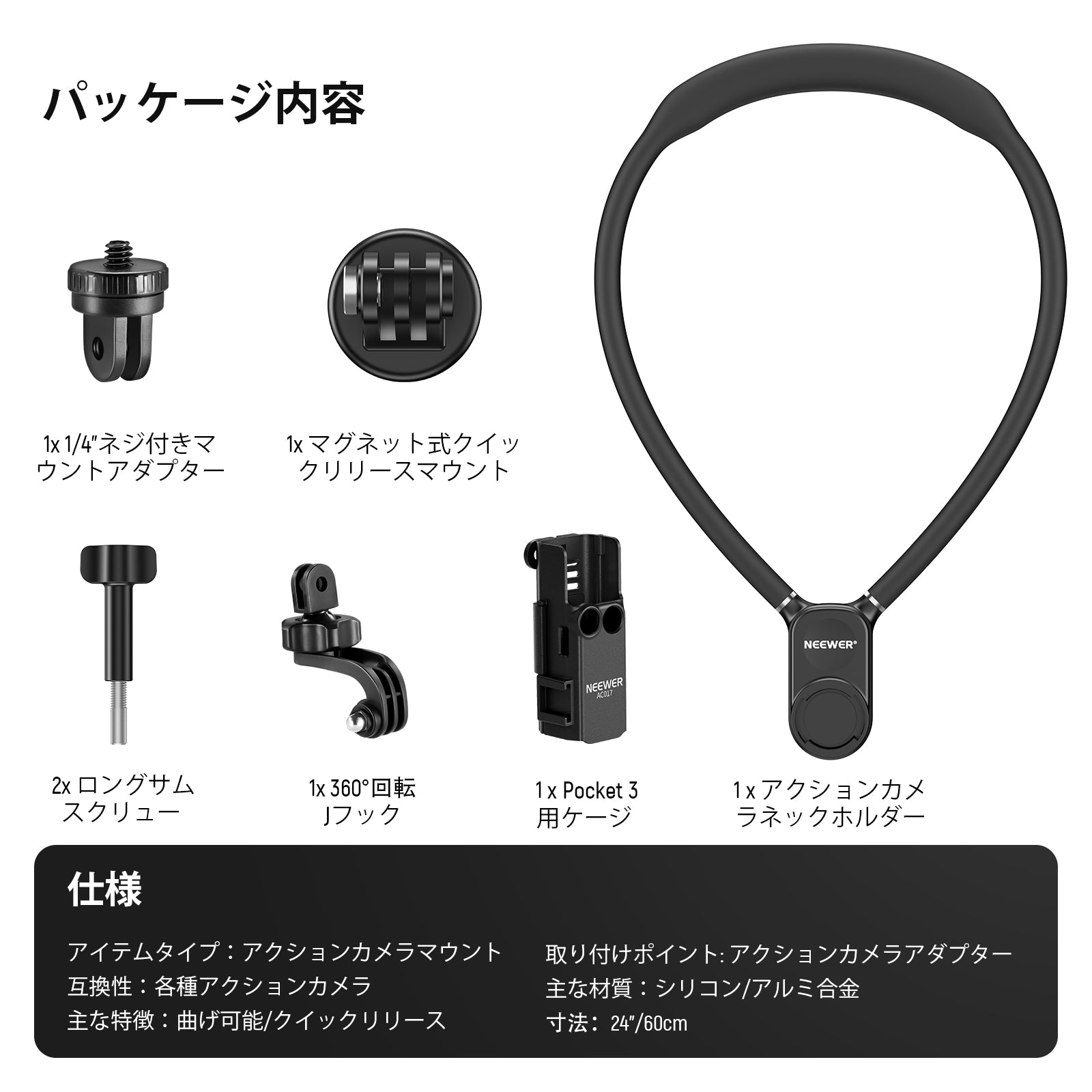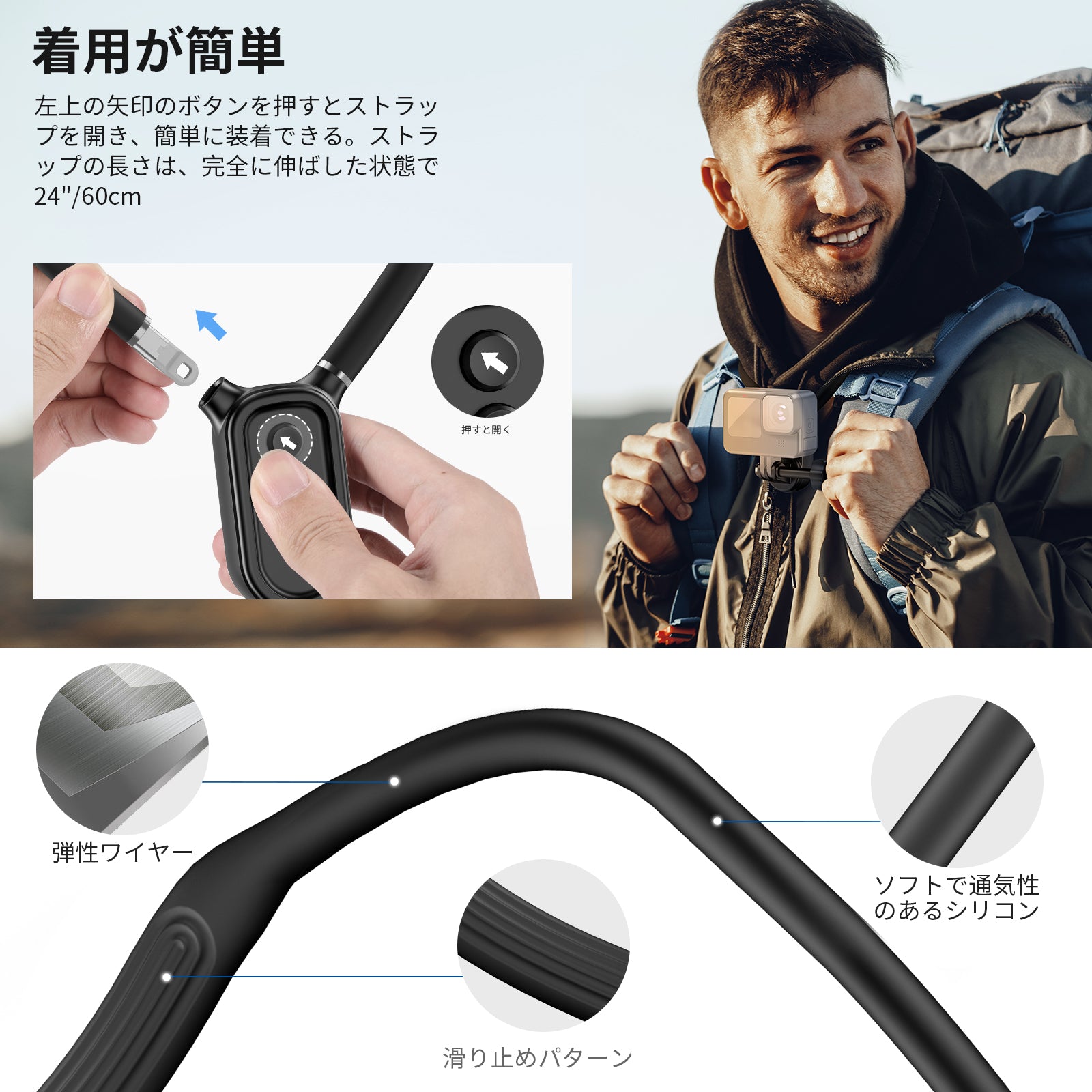 - 【POV撮影用首掛けマウントホルダー】アクションカメラ用首掛けマウントホルダーはネックレスのように装着し、POV撮影や臨場感あふれる動画撮影を胸の前で楽しめます。クイックリリースボタン(左上矢印)でネックストラップを簡単に着脱です。ネックストラップは、完全に伸ばした状態で長さ60cmです。