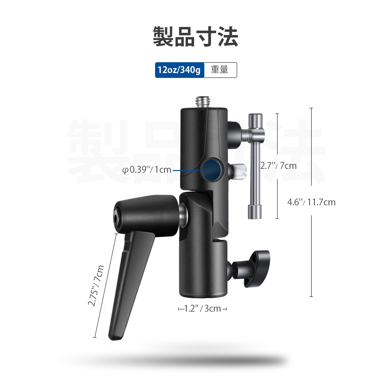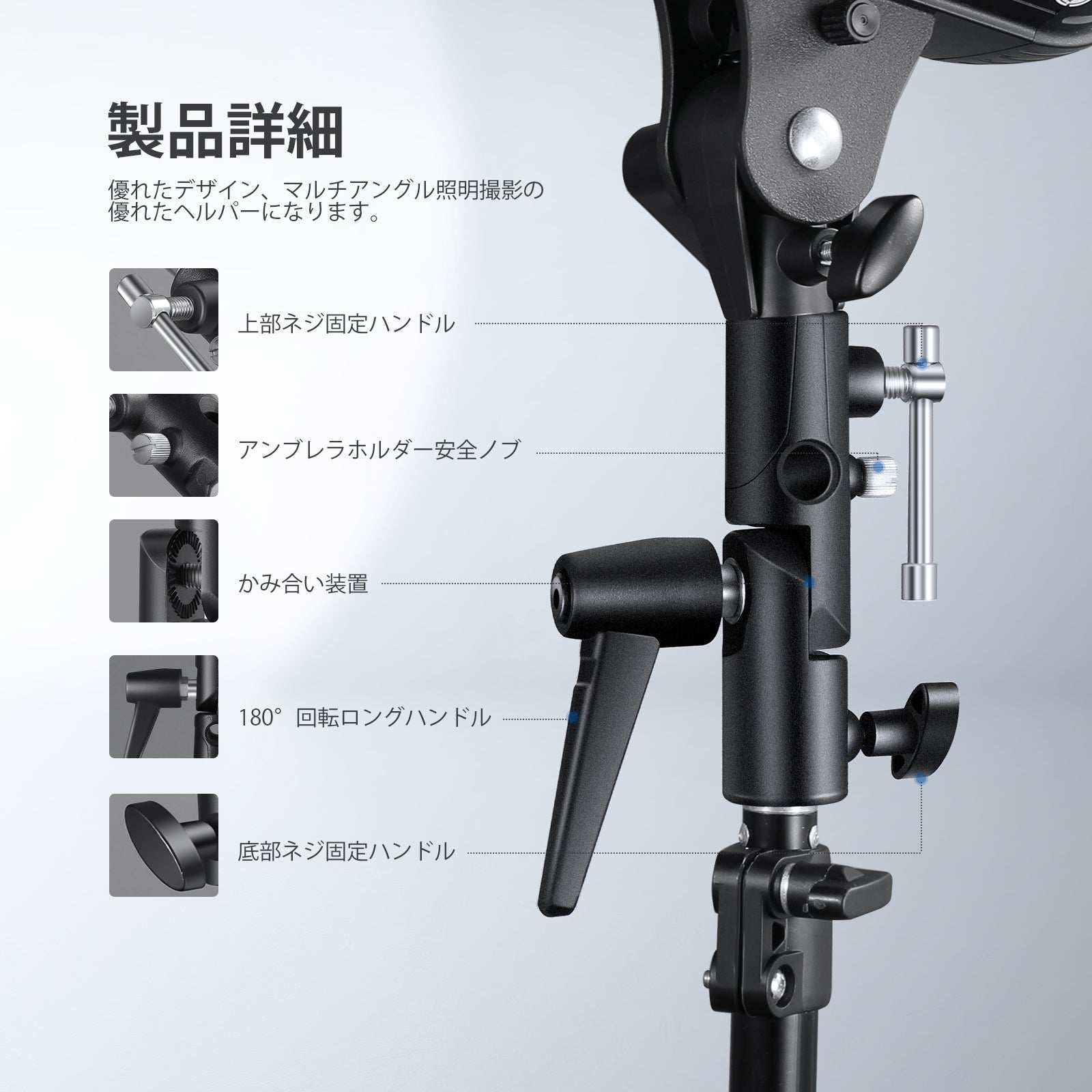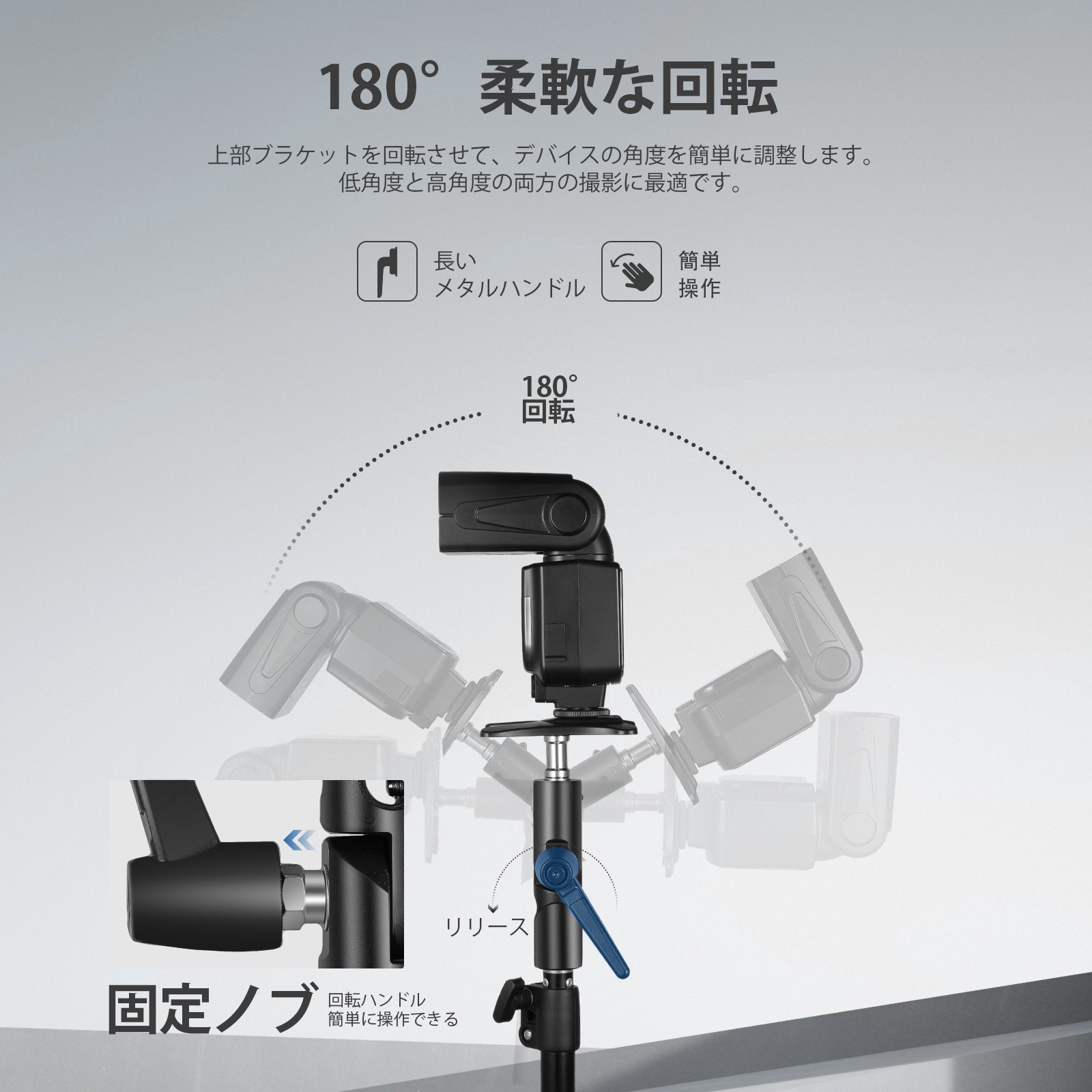 【柔軟なポジショニング&マルチアングル】上部ブラケットは調節可能なボルトで 2 つのパーツに接続していて、180° 回転して、フラッシュやその他の撮影デバイスをさまざまな角度に配置でき、低いアングルショットと高いアングル ショットの両方に最適です。長い金属ハンドルで操作が簡単になります。