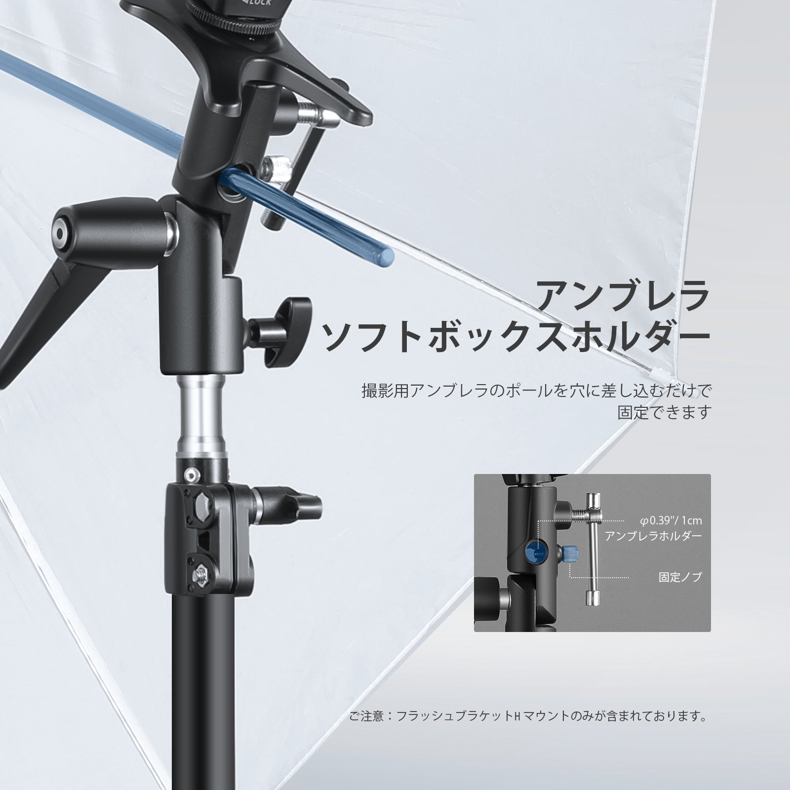 【1cm傘ソフトボックスホルダー】傘やソフトボックスをソケットに簡単に挿入し、ブラケットに固定します。スピードライトフラッシュは傘と一緒にを使用して、フラッシュ照明を柔らかく広げます。角度調整も可能です。