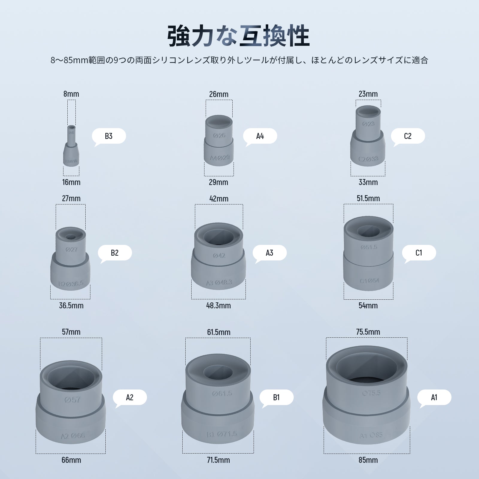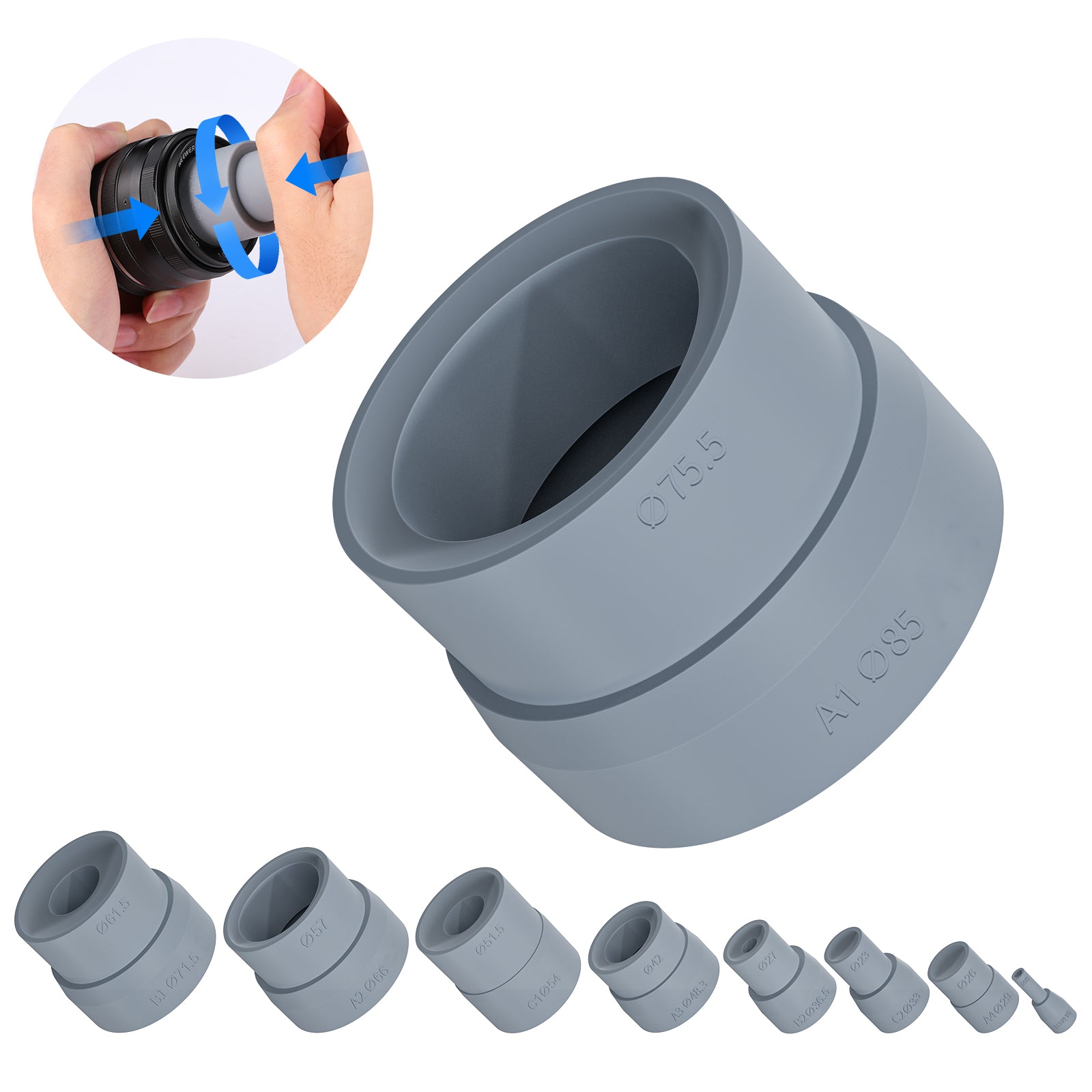- 【豊富なサイズバリエーション】キットは、直径8mmから83mmまでのシリコン摩擦リングを提供し、ほぼすべてのレンズサイズに対応します。8-16mm、23-33mm、26-29mm、27-36.5mm、42-48.3mm、51-54mm、57-66mm、61.5-71.5mm、75.5-85mmが含まれます。