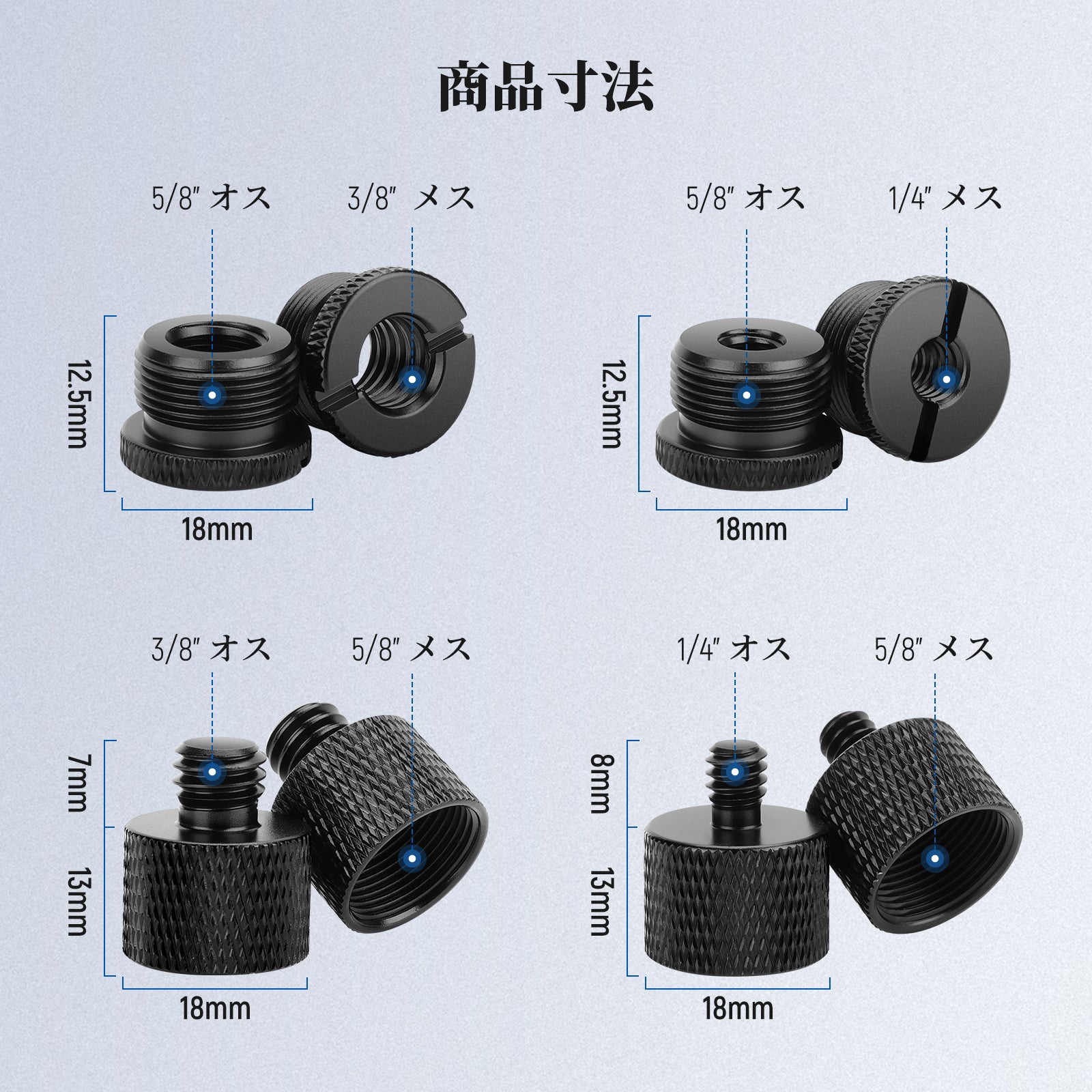 - 【マイクスタンドアダプターアクセサリーキット】ネジアダプターは、3/8"(メス)-5/8"(オス)、1/4"(メス)-5/8"(オス)、5/8"(メス)-1/4"(オス)、5/8"(メス)-3/8"(オス)アダプターがそれぞれ2個ずつ含まれ、マイクとマイクスタンドまたはブームアームを簡単に接続できます。カメラ、スマホホルダー、アクションカメラアダプター、リングライトなどを三脚やライトスタンドに取り付ける際にも使用でき、音楽録音、ビデオ録音、生放送、写真撮影、動画撮影、ポッドキャストなどに最適です。