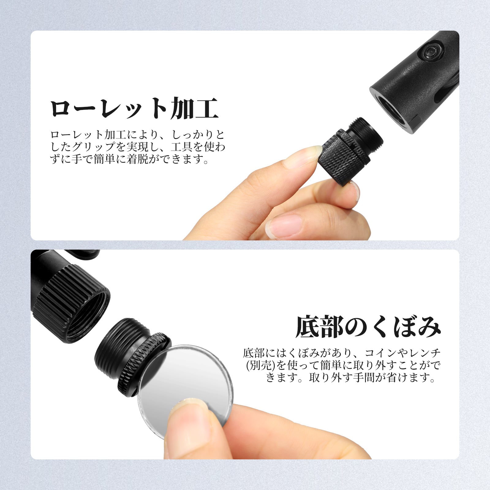 - 【底面スロットデザイン】3/8"-5/8"、1/4"-5/8"へのネジアダプターは、底面にスロットが設けられており、携帯用コインやレンチ(別売)を使って簡単に取り外しでき、取り外しの手間が省けます。