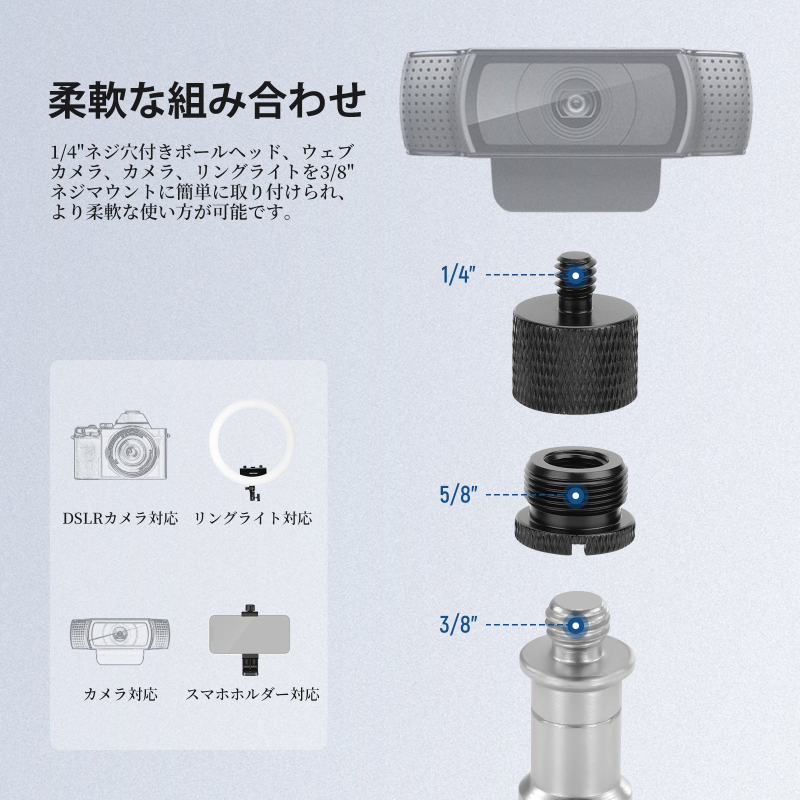 - 【多用途】マイクアダプターは、コンパチブル K669B、SM7B、QuadCast、SoloCast、Snowball、AT2020などで、ショックマウント、マイククリップ、その他のアクセサリーとも併用できます。 3/8"-5/8"へのネジアダプターを5/8"-1/4"へのネジアダプターに接続することで、1/4"ネジ穴付きボールヘッド、ウェブカメラ、カメラ、リングライトなどを3/8"ネジスタンドに簡単に取り付けられ、セットアップの汎用性が向上します。