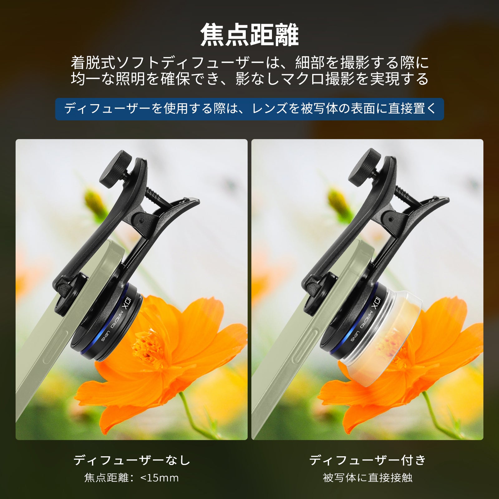 - 【焦点距離】ディフューザーを使用する場合は、レンズを被写体の表面に直接置きます。それ以外の場合は、レンズと被写体の距離を15mm以内に保ってください。