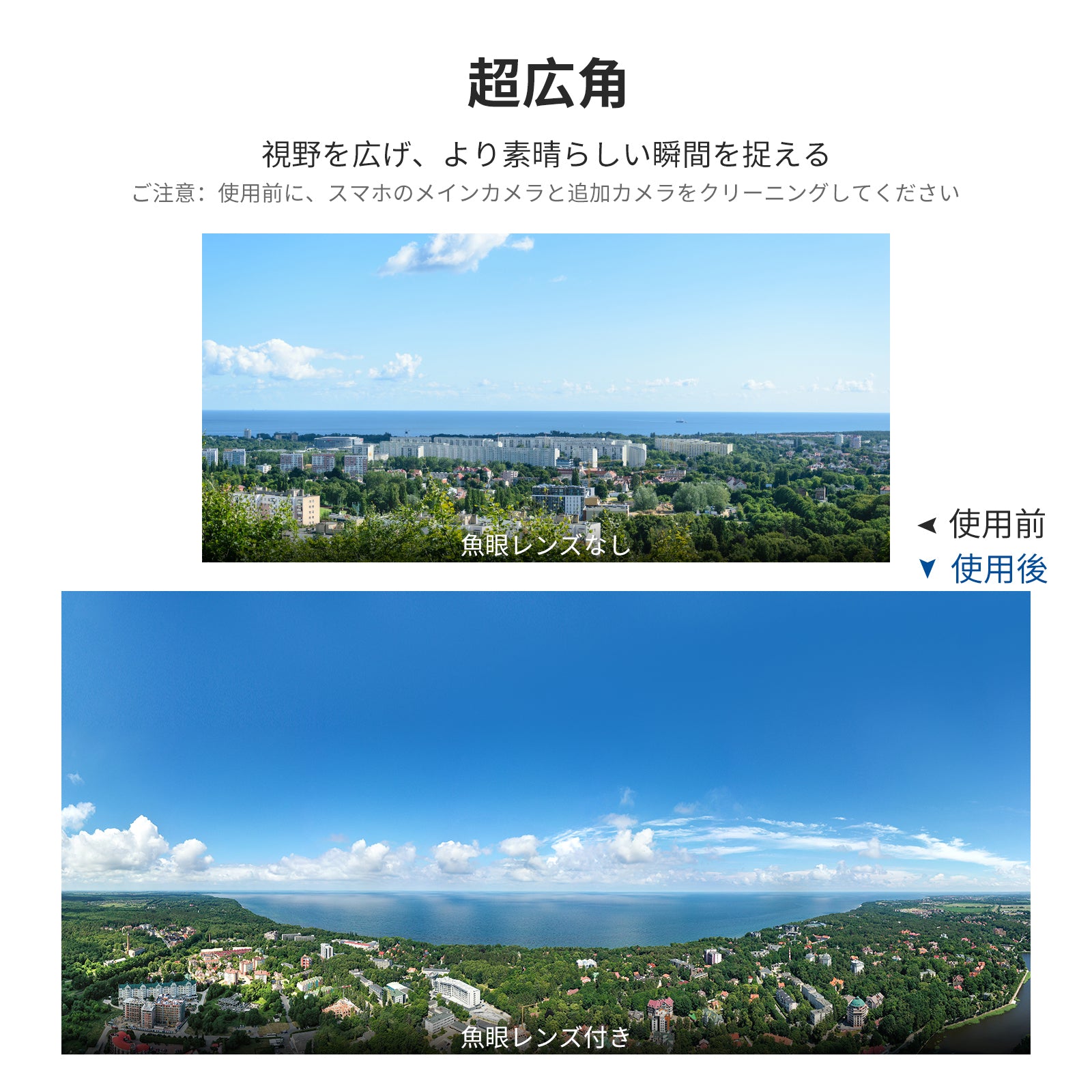 - 【ご注意】使用前に、スマホのメインカメラと追加カメラを掃除してください。スマホモデルによってはケラレが発生する場合があります。その場合は、レンズを締めるか、カメラの倍率を1.1倍以上にズームしてください。